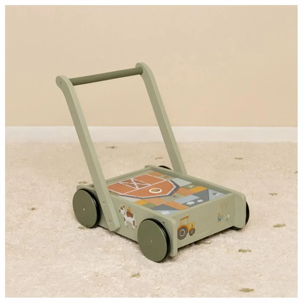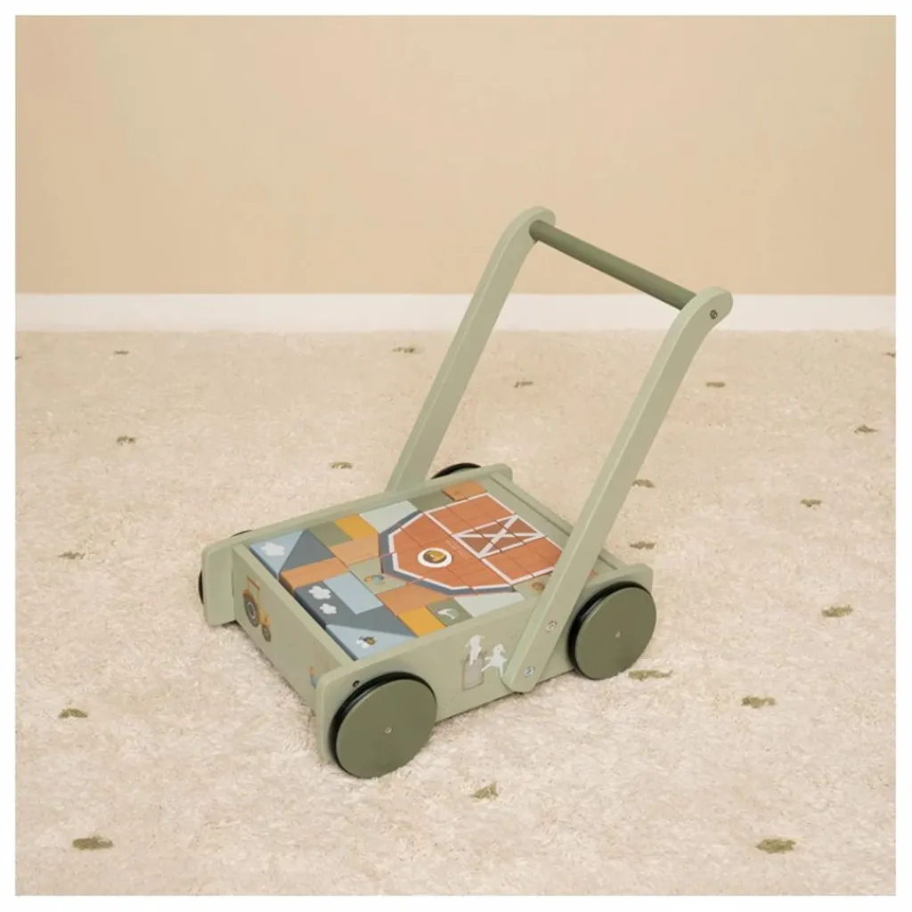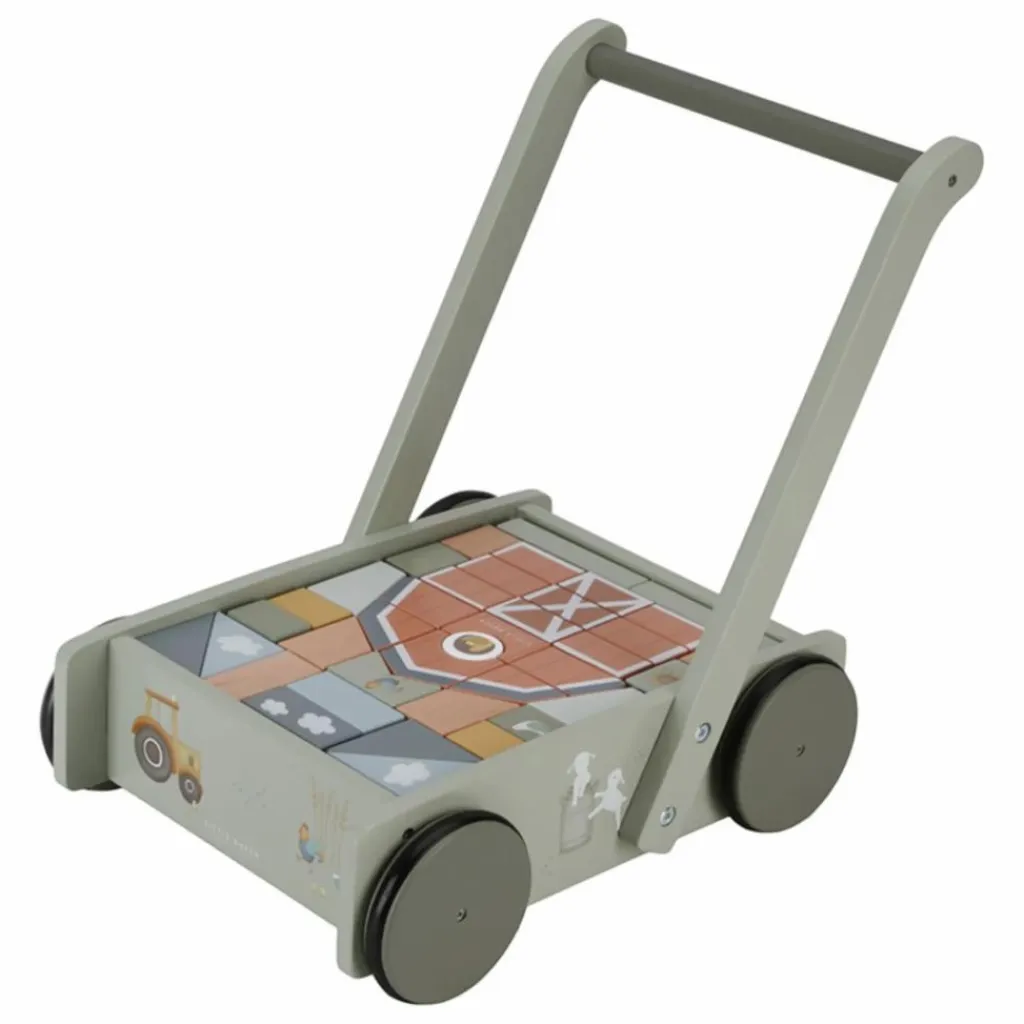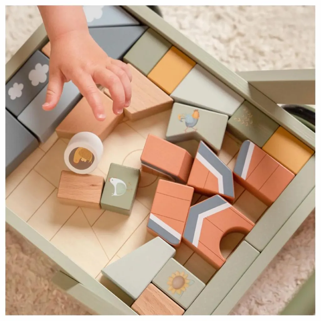 - Le chariot à blocs en bois est équipé de roues en bois et rempli de blocs de bois colorés présentant de belles illustrations de la collection Little Farm.