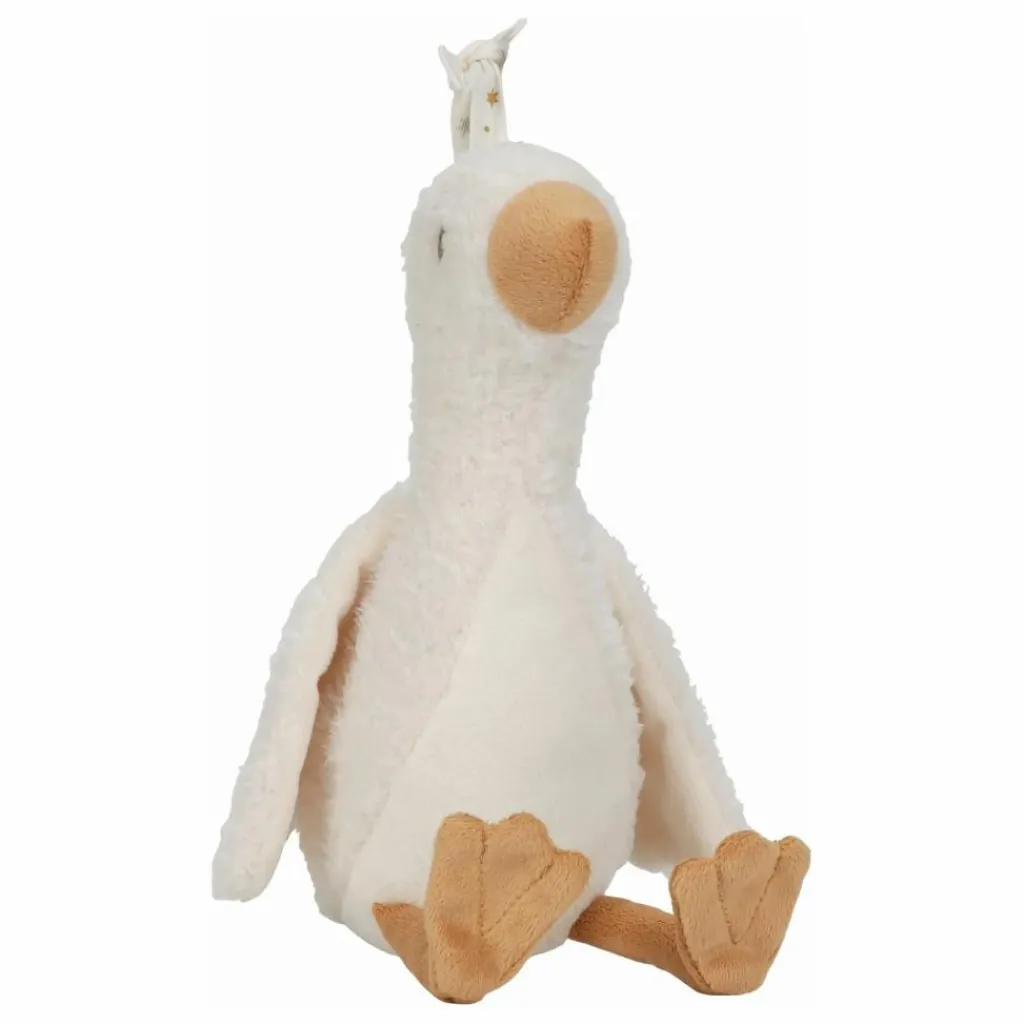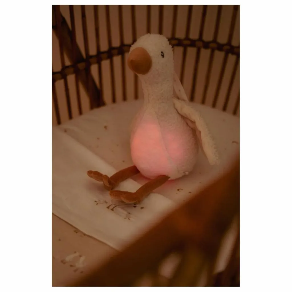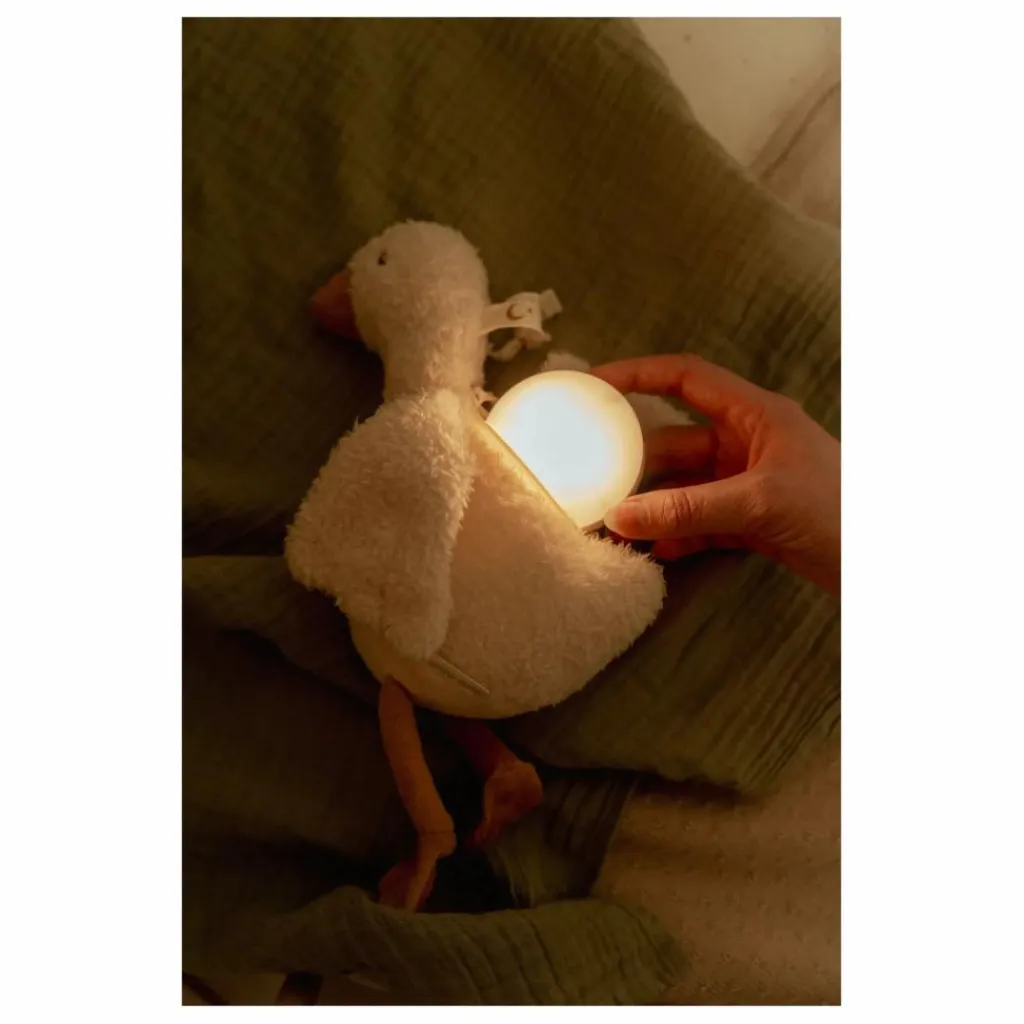 - Un ami pour faire de beaux rêves. La Cuddle Goose Light & Sound offre amour, confort et sécurité grâce à sa douce lueur et à ses sons apaisants, tels qu’une douce mélodie, les battements du cœur et les bruits de l’utérus. Cette adorable petite oie aide votre bébé à se détendre et à s’endormir. Elle est fabriquée dans un tissu doux et câlin. Un compagnon réconfortant de jour comme de nuit. Cette petite oie peut faire 8 couleurs différentes grâce à son boîtier qui s’insère dans la peluche. Le boîtier se recharge avec un cable USB-C qui est fourni avec la peluche.