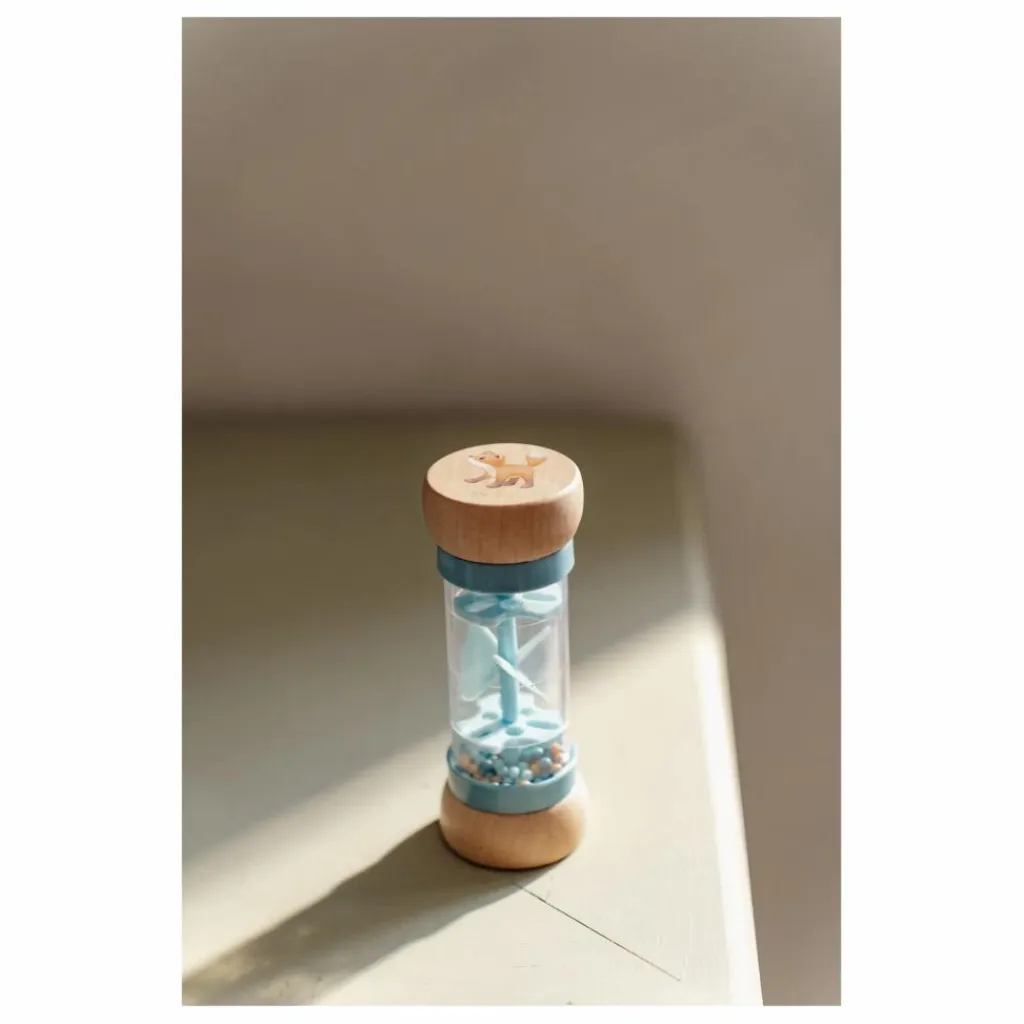 - Retourne le hochet et écoute les sons reposants émis par les billes qui se déplacent d’un côté à l’autre du bâton de pluie. Il stimule le développement sensoriel et le talent musical de bébé. Les billes, de 3 couleurs différentes, tombent dans de petites ouvertures dans le tube et font tourner l’hélice, ce qui émet un son agréable. Le hochet bâton de pluie est conçu pour les petites mains. Le dessus et le dessous en bois sont décorés d’une illustrations sur le thème de la collection Forest Friends.
