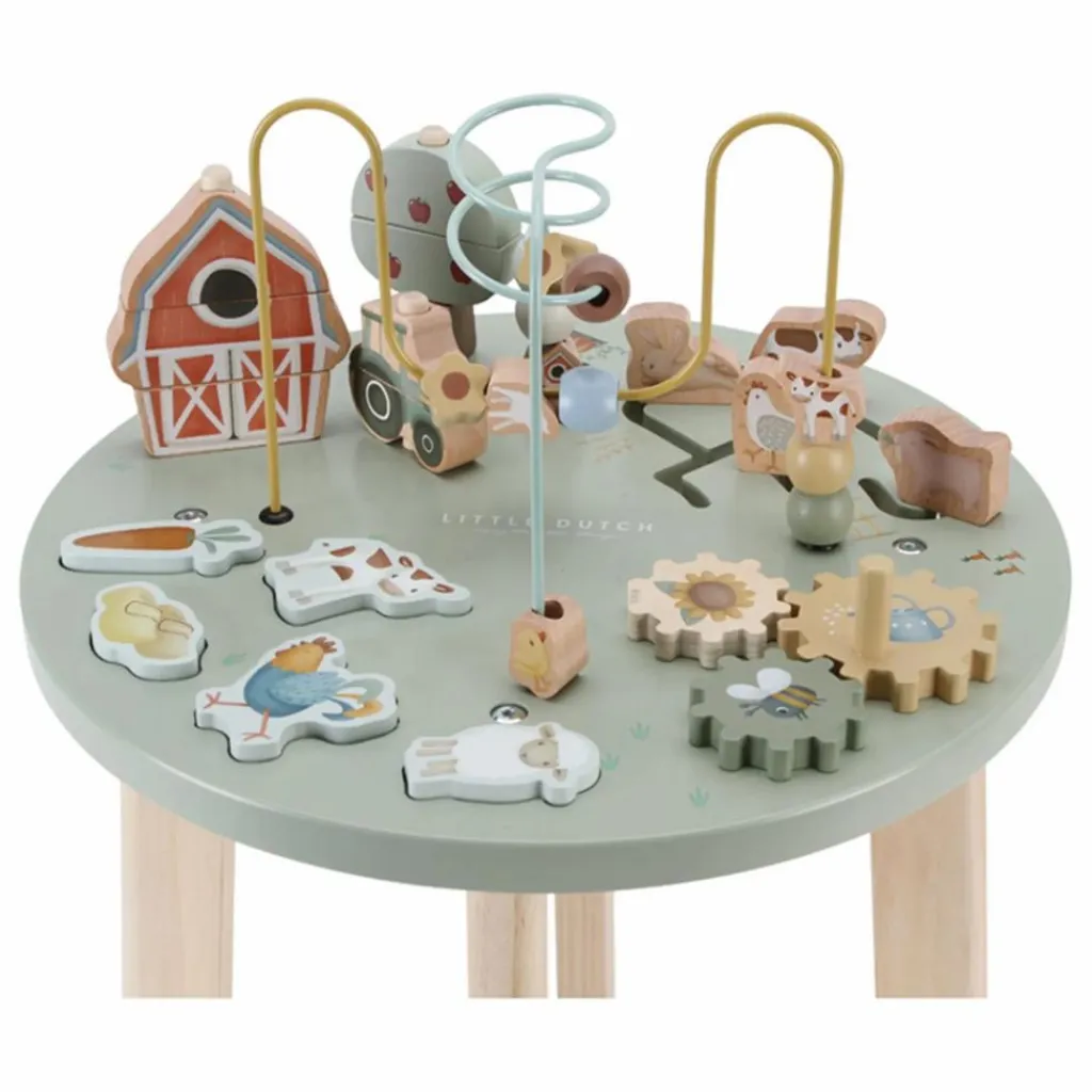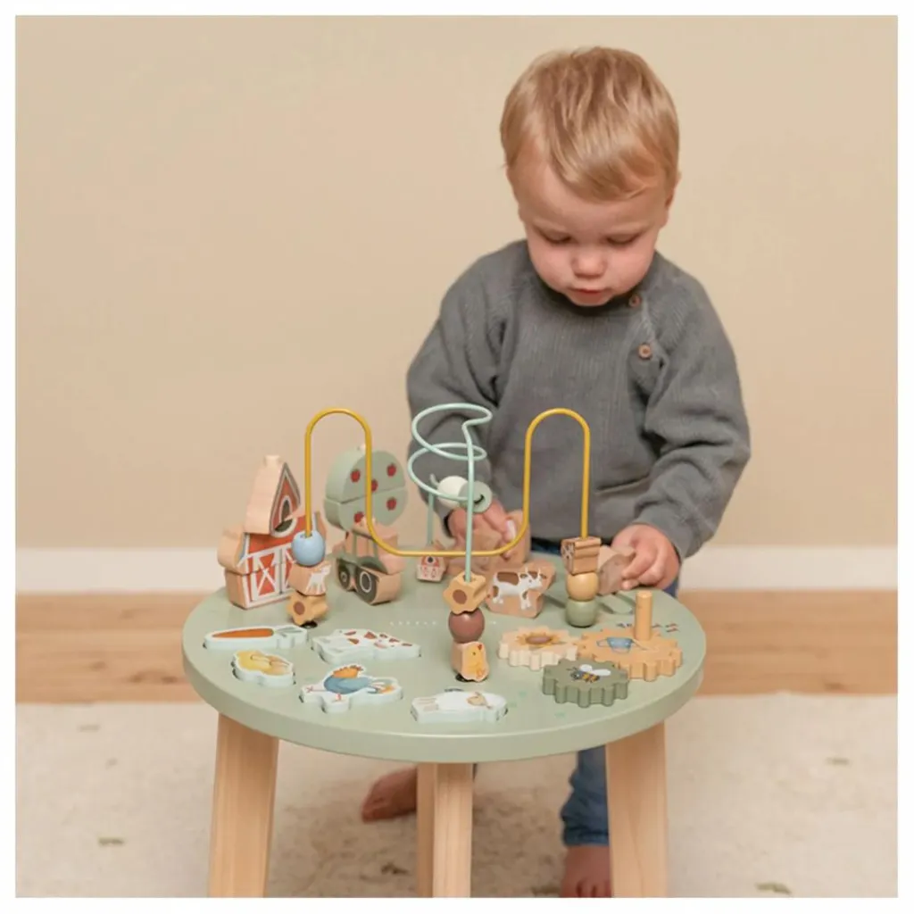 - Levez-vous et jouez! Découvrez toutes les activités que cette table a à offrir. Déplacez les perles d’un côté de la spirale à l’autre. Ou construisez la ferme. Résolvez le casse-tête, tournez les engrenages et déplacez le petit mouton, la vache et la poule.