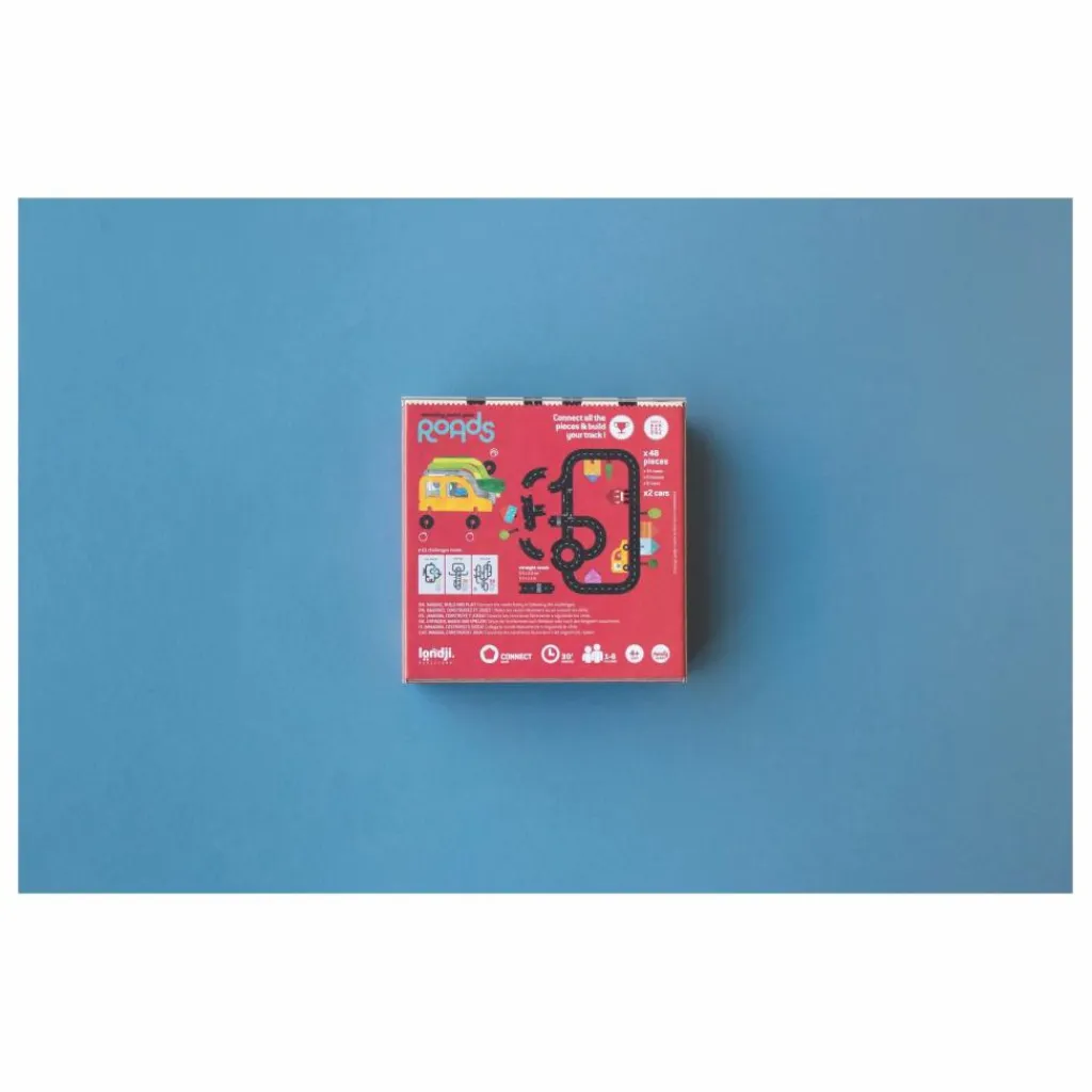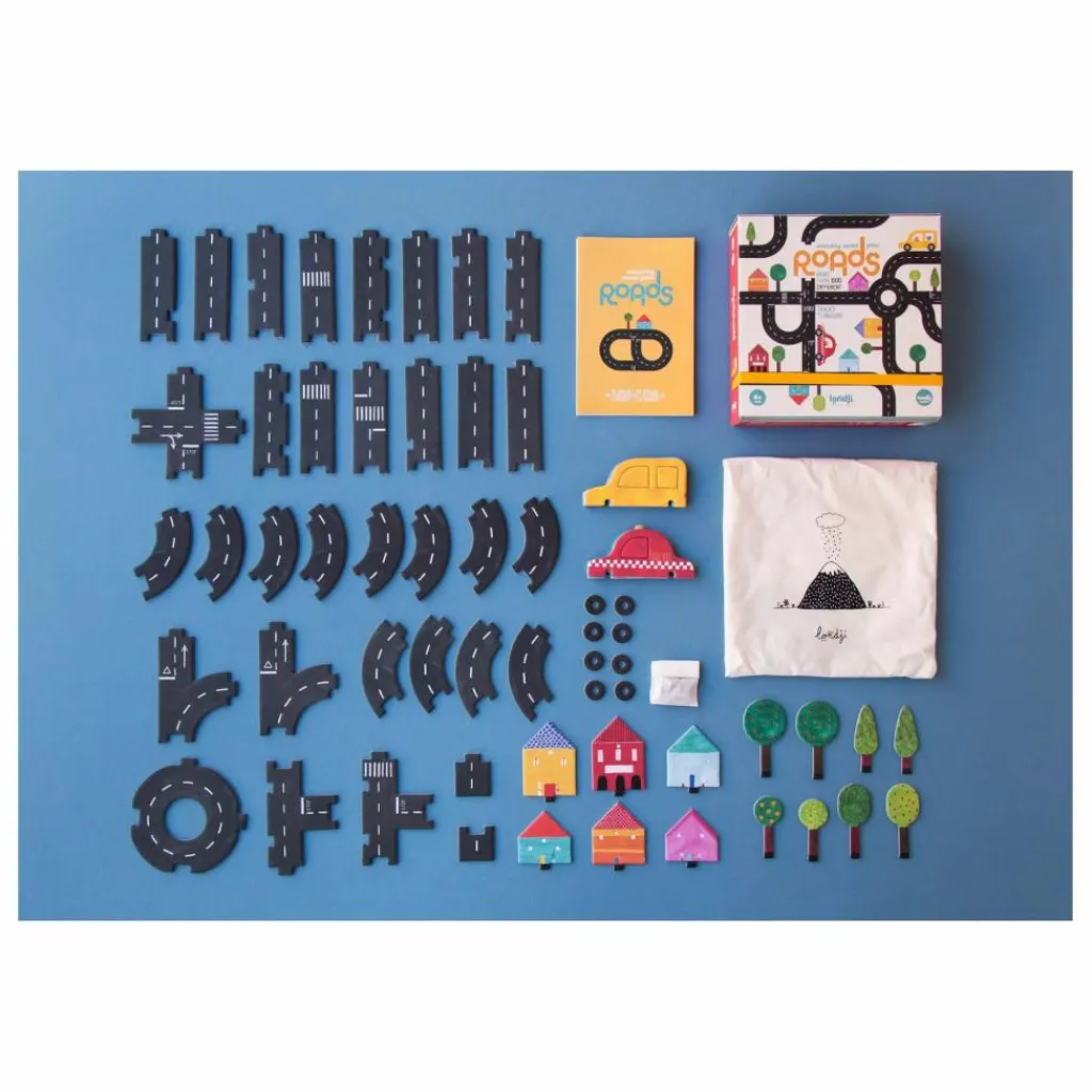 - Jeu de 48 pièces à assembler pour créer un circuit (11 circuits possibles) : 34x routes – x6 maisons – x8 arbres – 2x voitures – pochette tissu