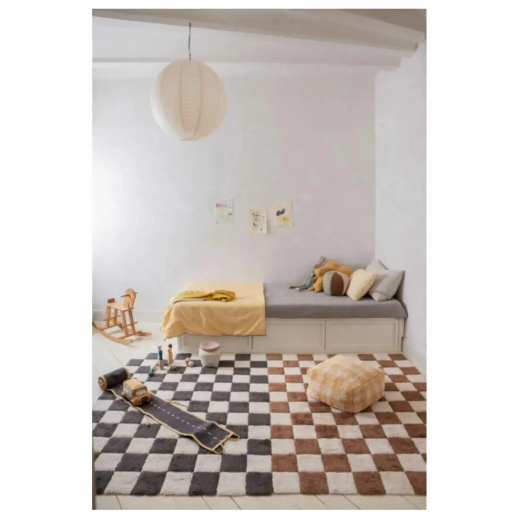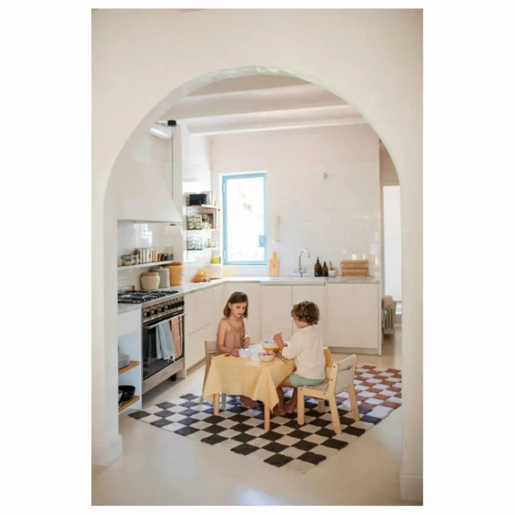 - Inspiré des sols en céramique vintage, le tapis Kitchen Tiles présente un motif à carreaux jouant avec des couleurs contrastées naturelles et gris foncé. Le tapis utilisait notre base en mélange RugCycled / toile naturelle, laissant la base légèrement visible entre les carrés colorés simulant les carreaux de la cuisine.