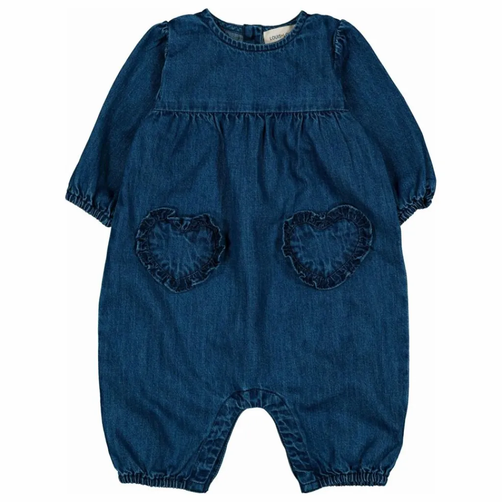 Détails : Combinaison longue patchwork velours et chambray, boutonné sur le devant, deux poches plaquées coeur, boutons pressions à l’entrejambe.