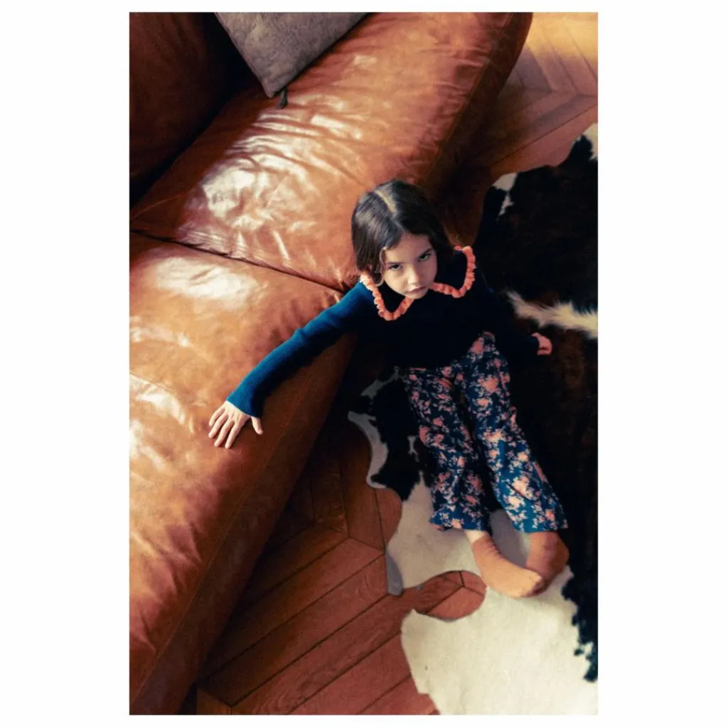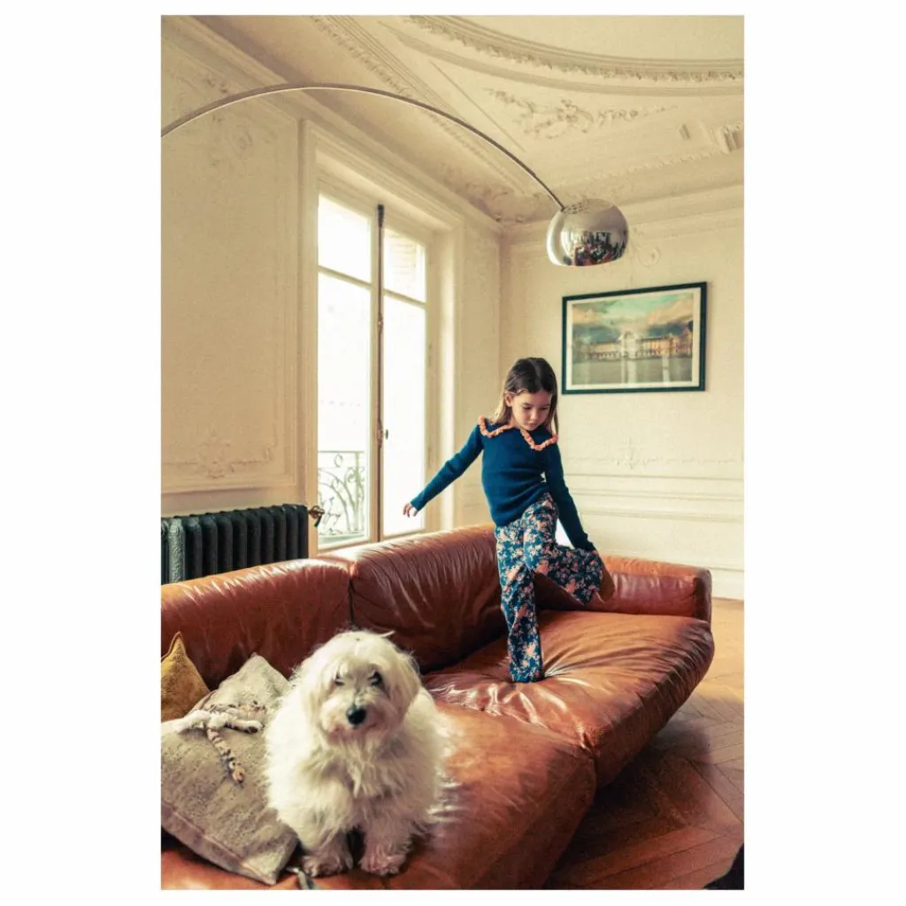 Détails : Jean patte d’eph, taille élastiquée, genouillére en forme de cœur imprimé fleuri.