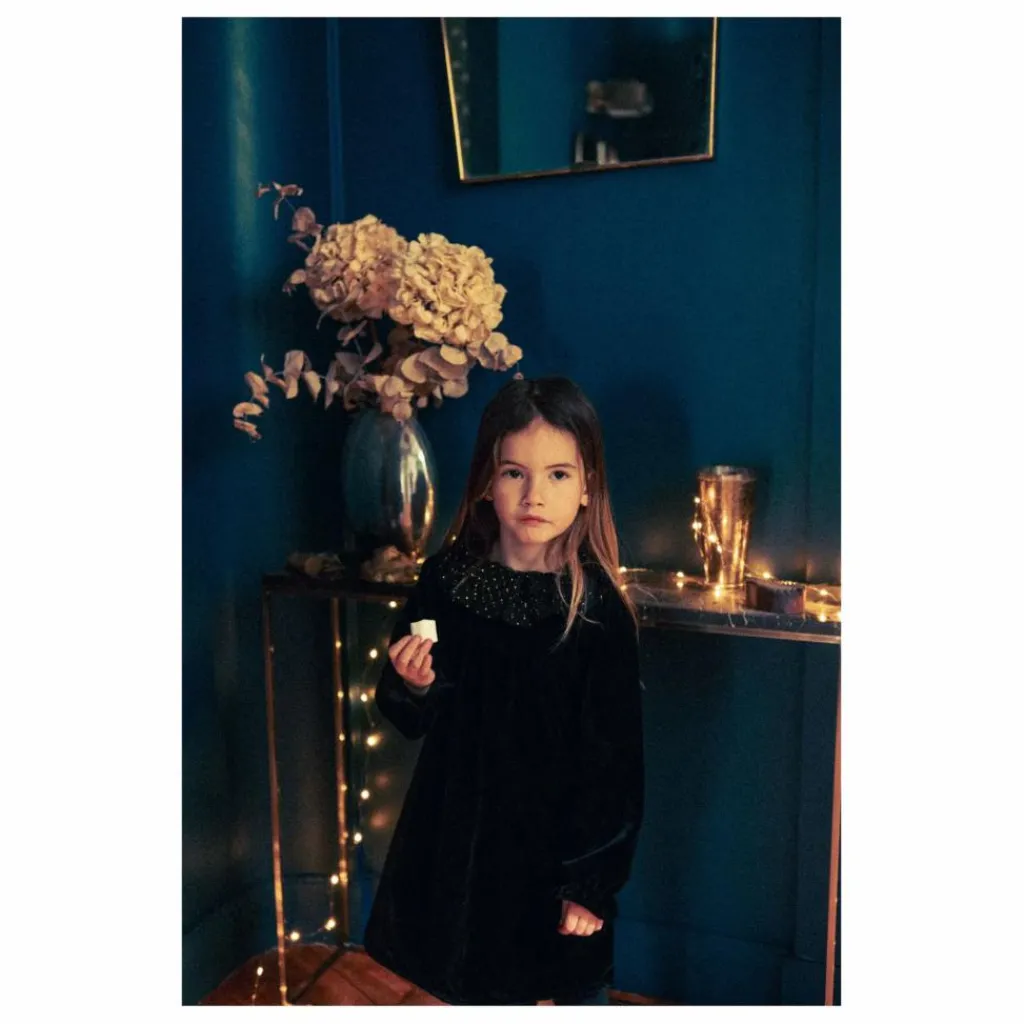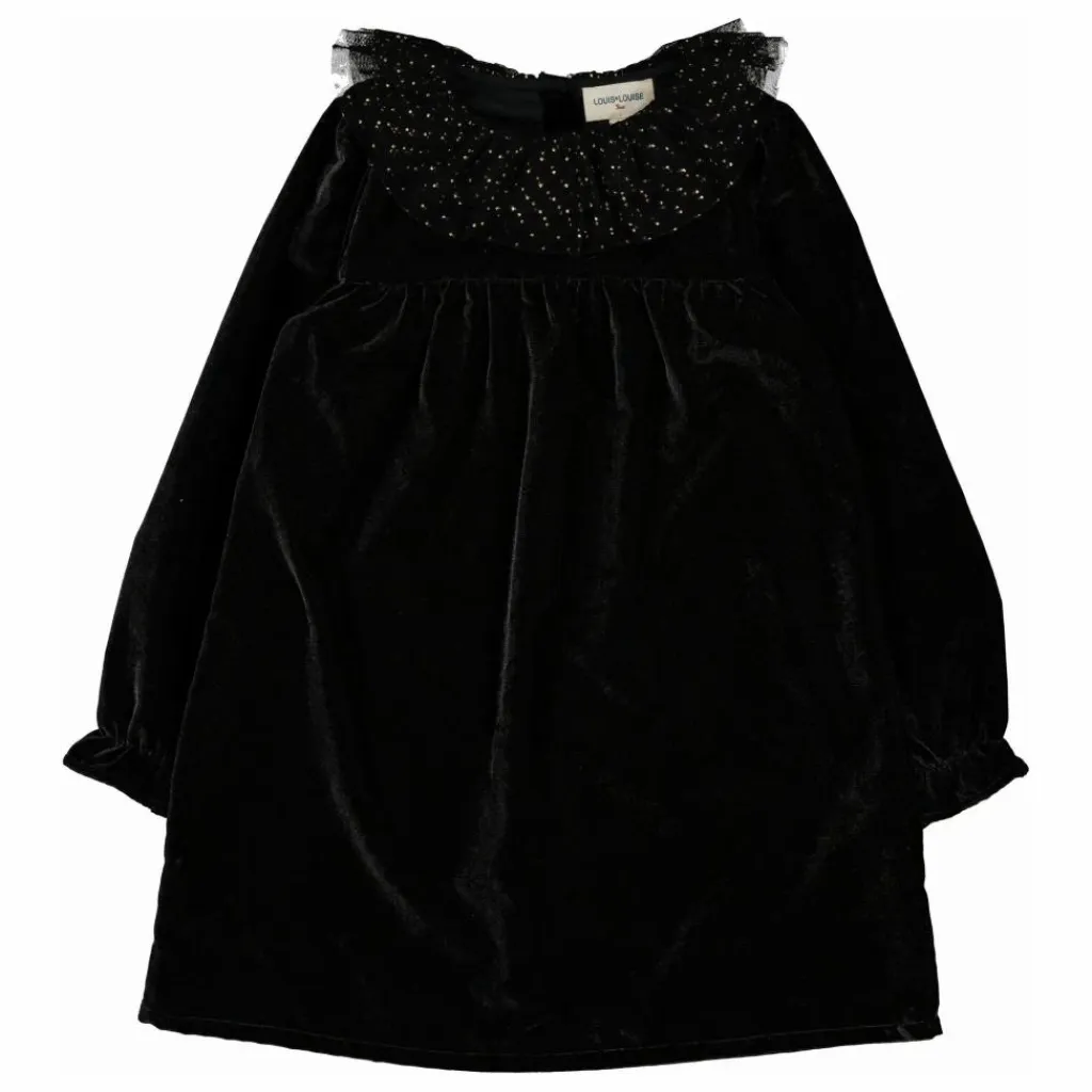 Détails : Col volanté en tulle pois doré, forme courte, manches longues élastiquées, patte de boutonnage au dos.