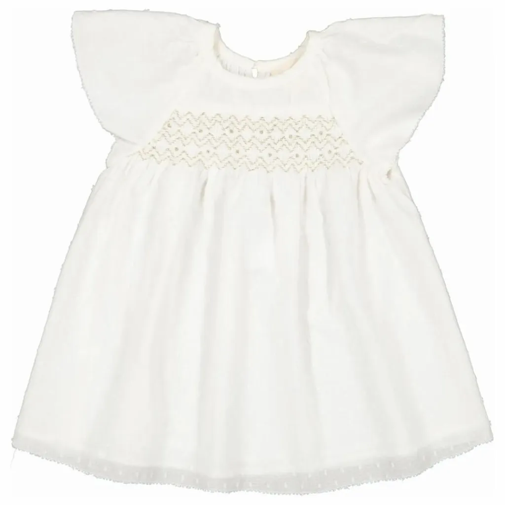 - Détails : Smockée au plastron, manches évasées, patte de boutonnage dans le dos, parfaite pour les cérémonies estivales.