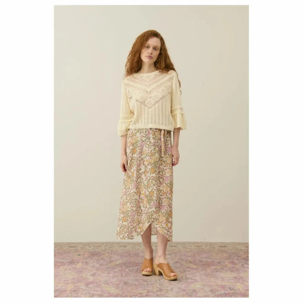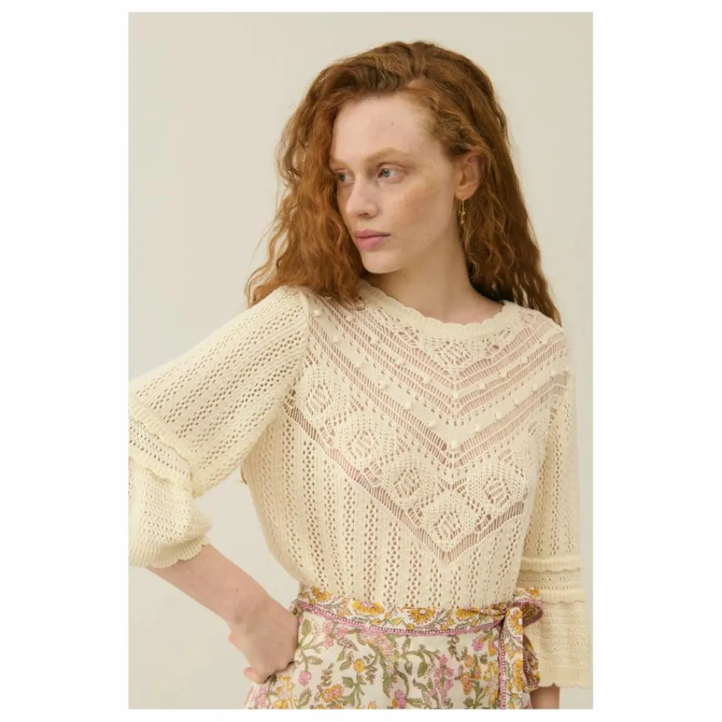 Jeu de points, détails ajourés et petits pompons, inspiration crochet.