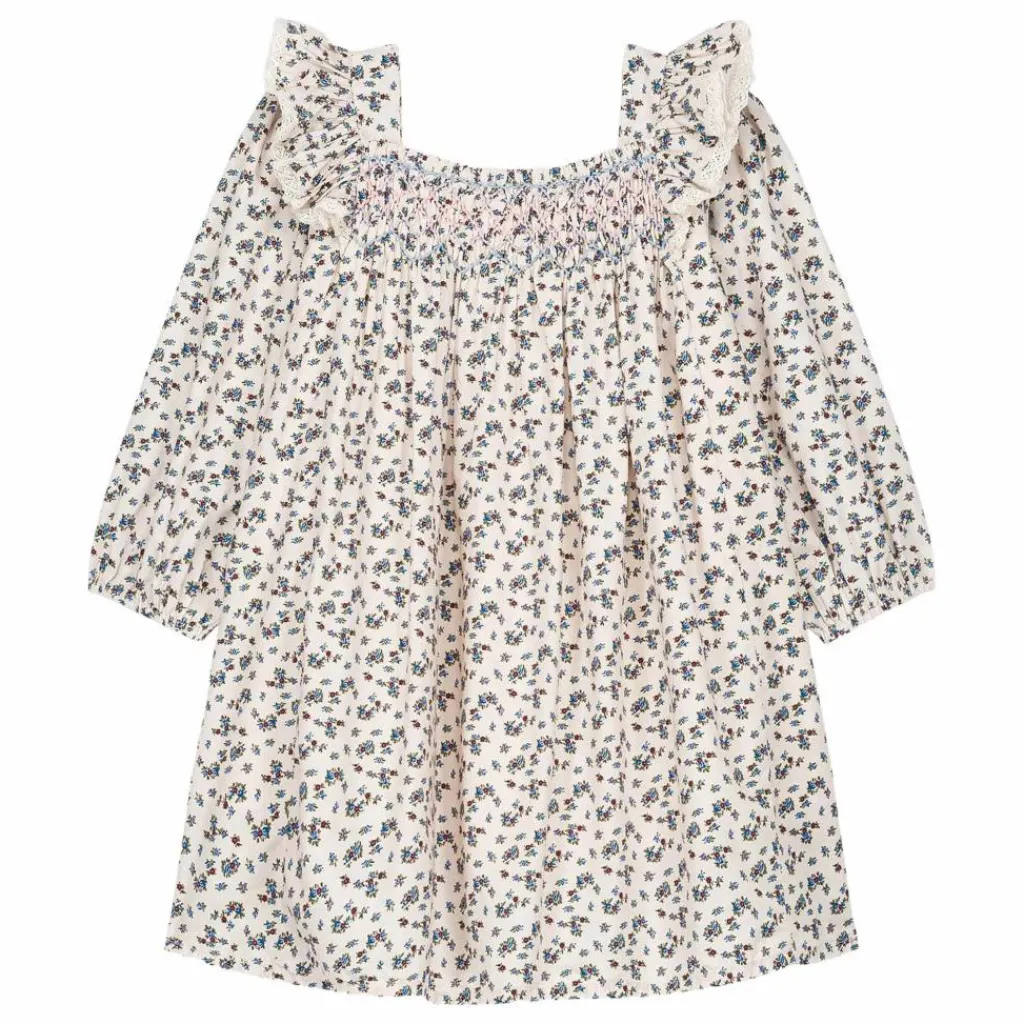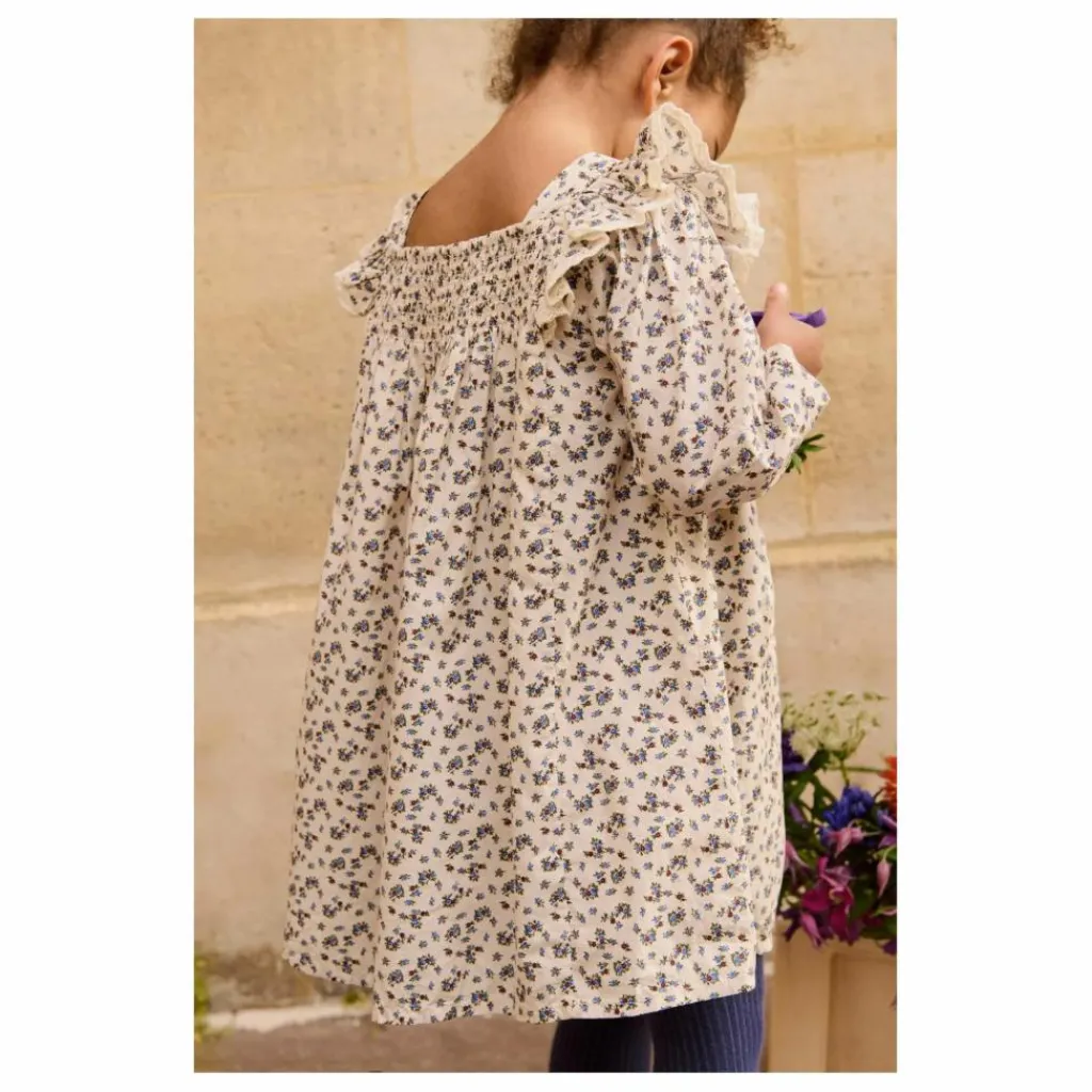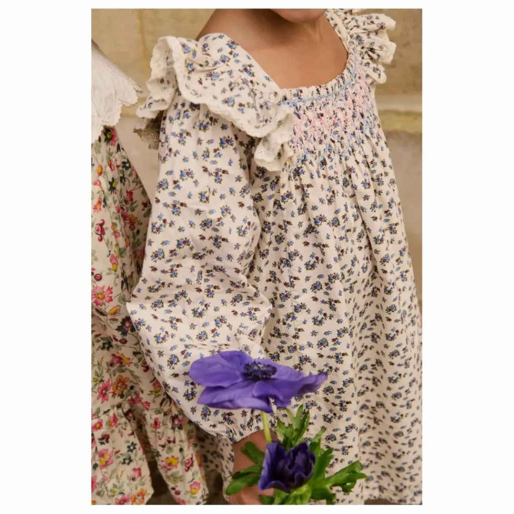 Détails smockés et brodés à la main à l’encolure.
