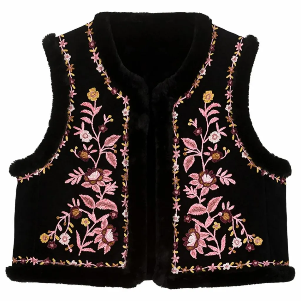 Une face en velours de coton brodée, et une face en fausse fourrure.