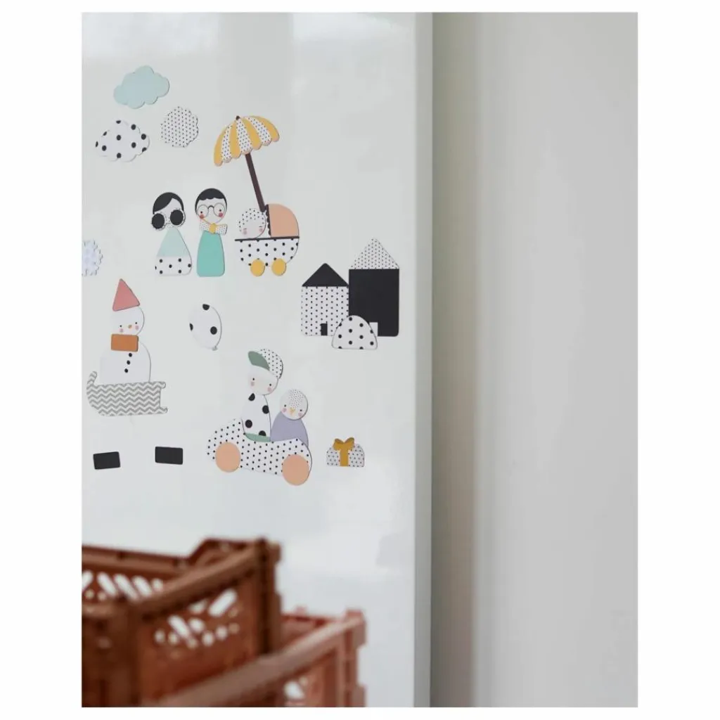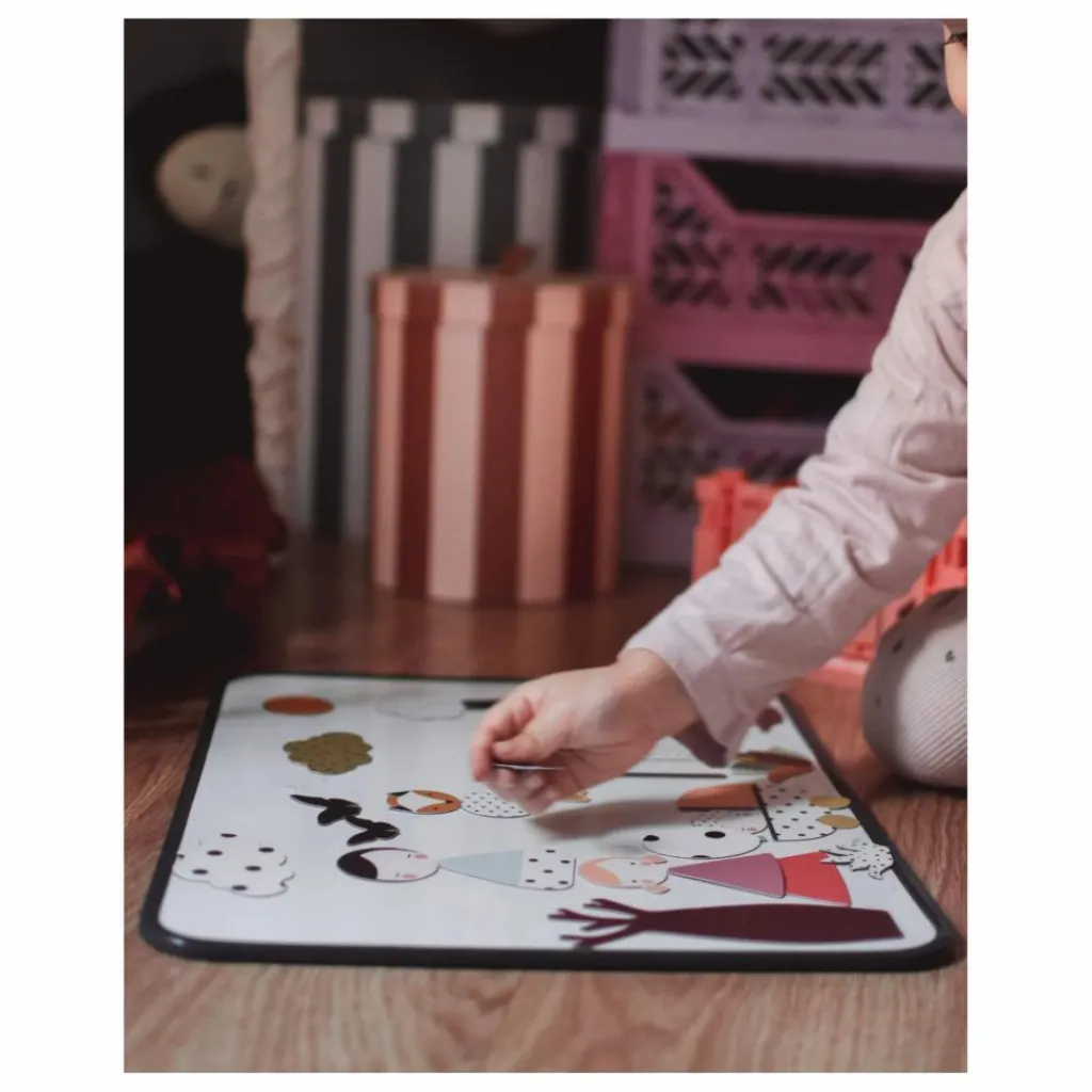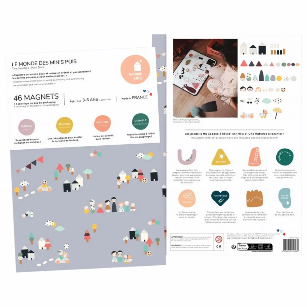 - 46 magnets (2 planches magnétiques A4 pré-découpées. Les formes sont à détacher du support délicatement). + 1 coloriage au dos du packaging.