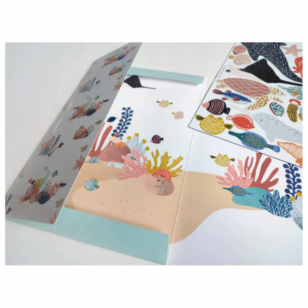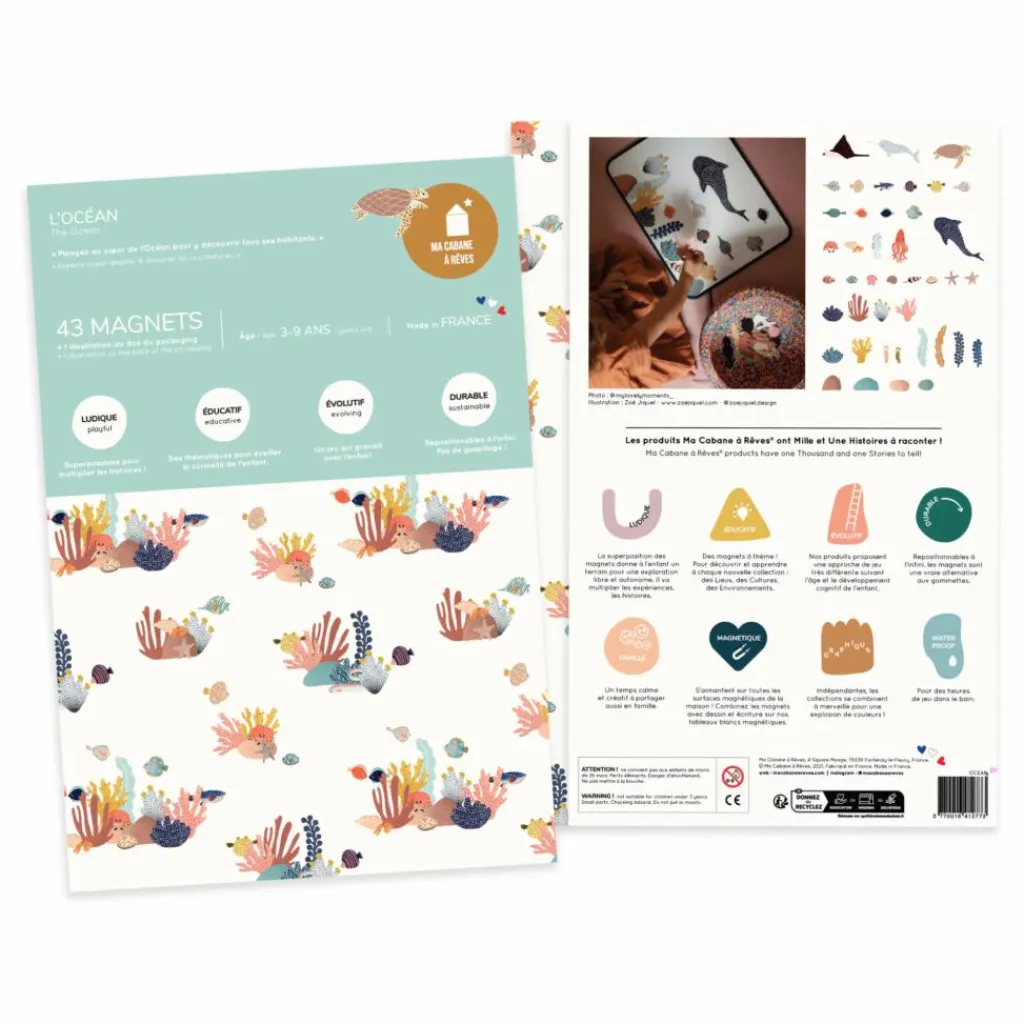 - 43 aimants sur le thème de l’Océan, des aimants « animaux »: requin-baleine, tortue, narval, poulpe, raie manta, crabe, bernard-l’hermite, régalec, poisson-globe, hippocampe, étoile de mer, anémones de mer, coraux, coquillages etc, des aimants « nature »: algues, rocher etc, 1 illustration au dos