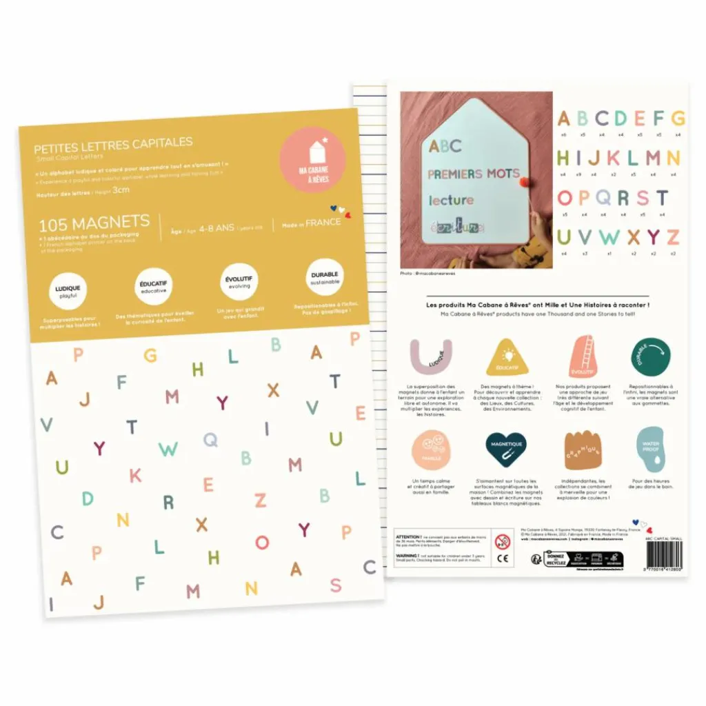Ma Cabane à Rêves a développé une gamme éducative et évolutive qui accompagne l’enfant dans l’apprentissage de l’écriture et de la lecture. Cet alphabet magnétique est adapté aux enfants de CP et CE1 (6 – 8 ans). Utilisez le à la maison comme outil complémentaire des livres scolaires.
