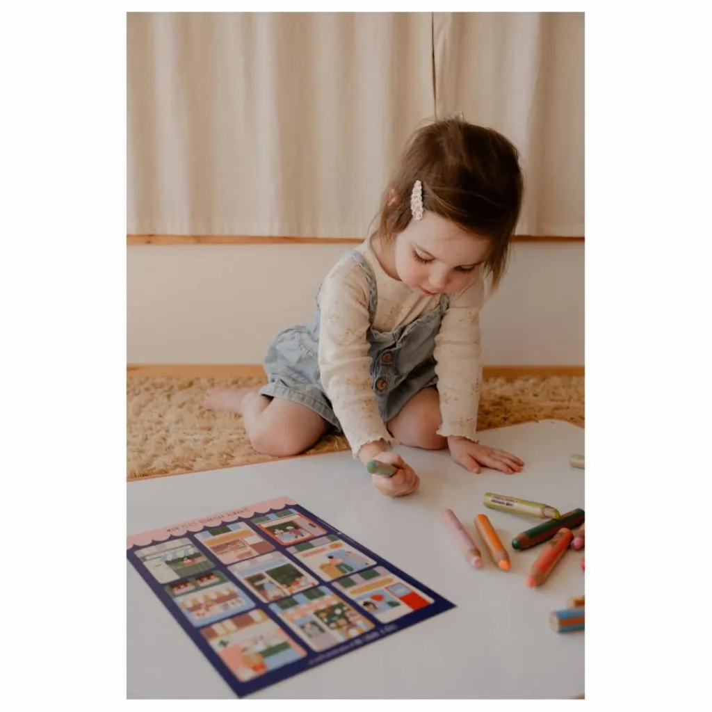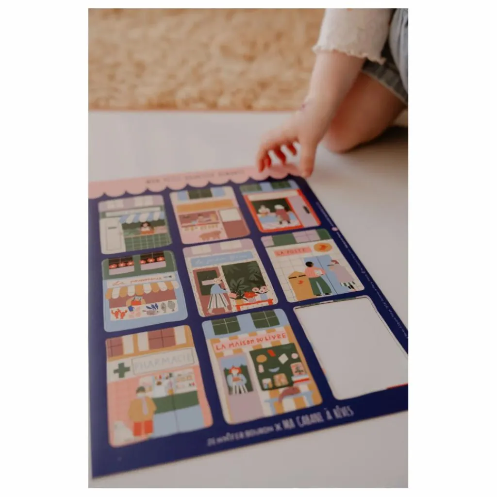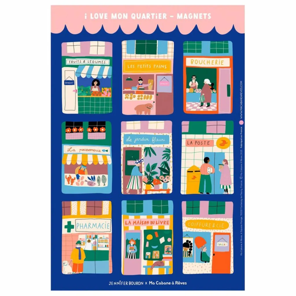 Transformez votre frigo ou tableau magnétique en petite ville pleine de vie ! Ce set de magnets illustré par Jennifer Bouron met en scène les lieux emblématiques du quotidien : boulangerie, boucherie, pharmacie, librairie et bien plus encore. Parfait pour éveiller les plus petits à leur environnement quotidien tout en décorant joliment votre intérieur.