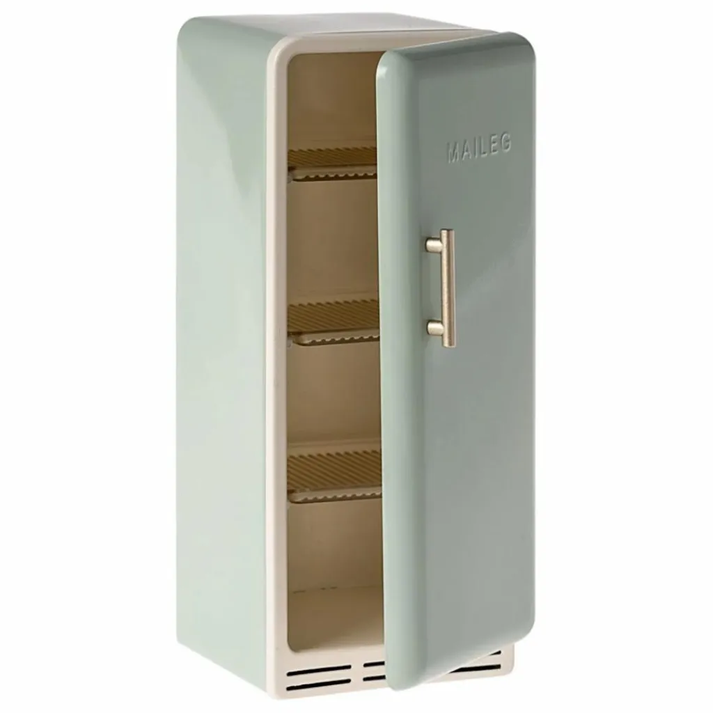 Un réfrigérateur vintage qui s’intègre parfaitement à la maison de poupée miniature « dollhouse ». Il est en métal avec une fermeture magnétique et des étagères givrées à l’intérieur.