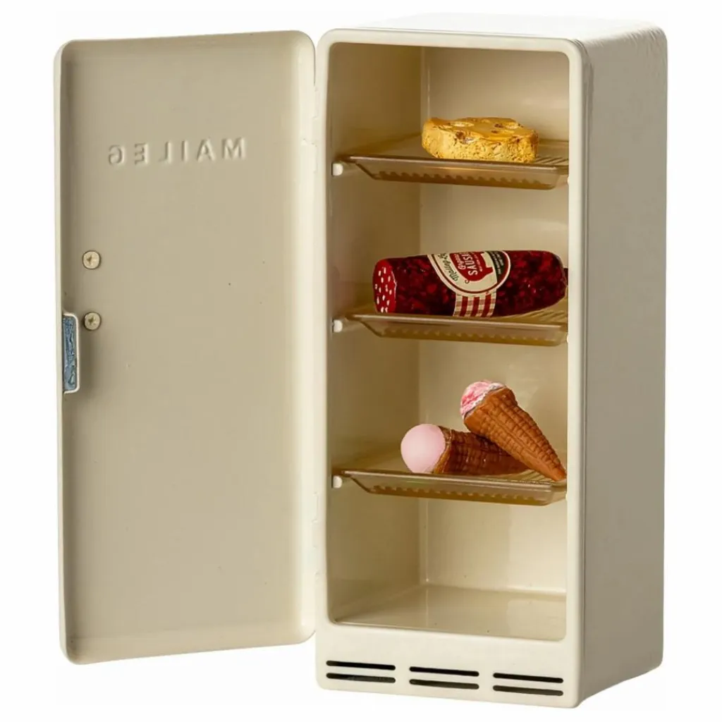 - Un réfrigérateur vintage qui s’intègre parfaitement à la maison souris Farmhouse Maileg. À l’intérieur du réfrigérateur, vous trouverez un morceau de fromage, une saucisse et quelques glaces. Ceux-ci prolongeront l’histoire en cours et le jeu.