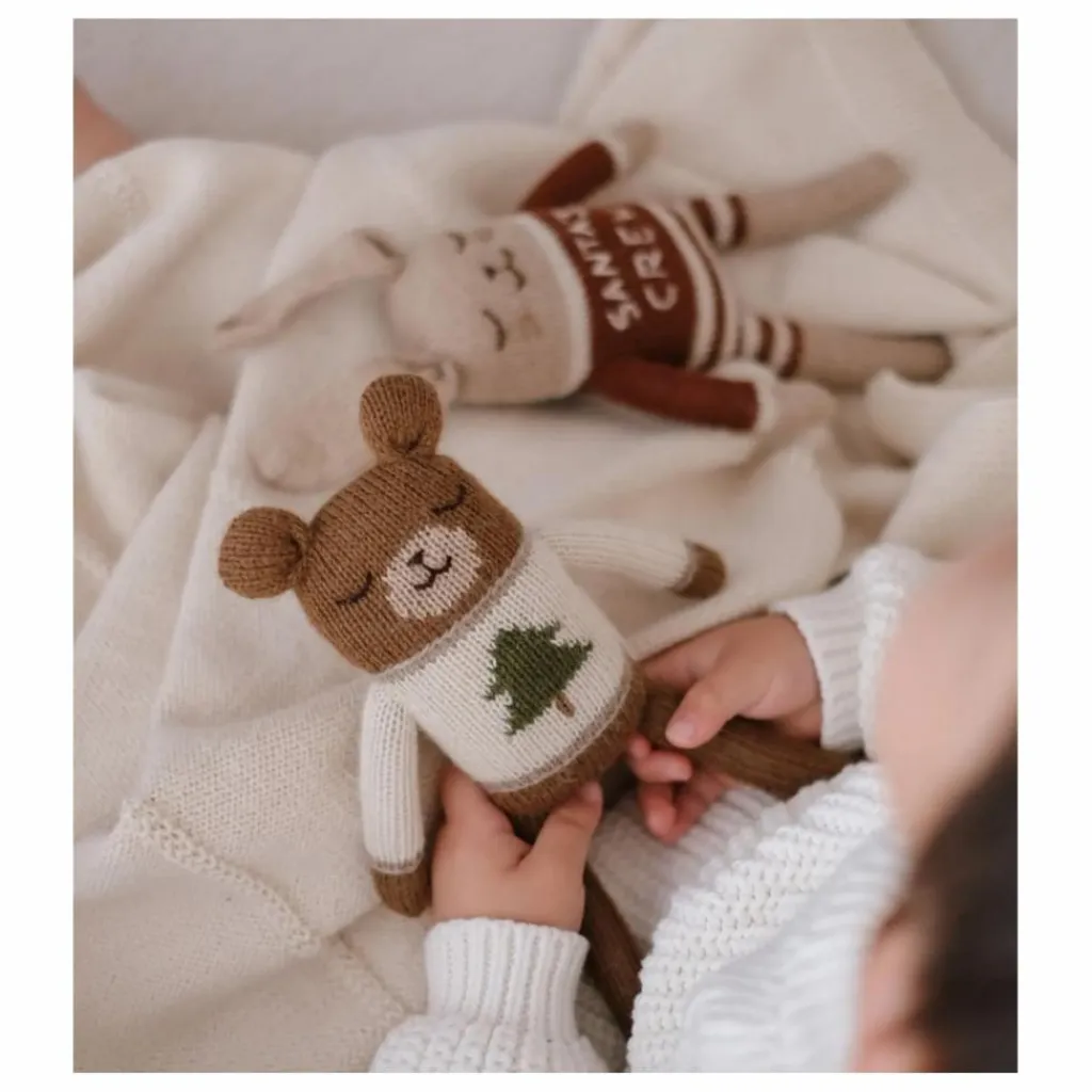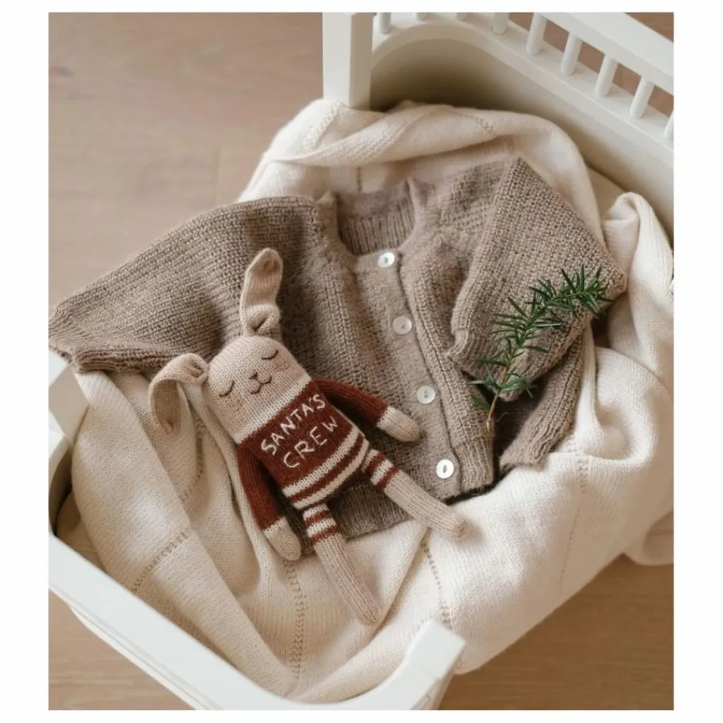 Ce doudou est entièrement tricoté à la main dans un atelier équitable en Bolivie. Sa confection minutieuse participe à préserver des savoir-faire et des techniques respectueuses des humains et de la nature. Il est réalisé en pure laine baby alpaga, une matière antibactérienne très douce, particulièrement adaptée aux peaux sensibles.