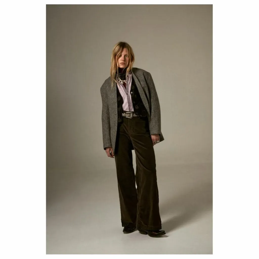 - Pantalon en velours côtelé marron chocolat, à taille haute et jambes évasées. Sa texture épaisse et douce offre confort et élégance, idéal pour affronter la saison froide avec caractère.