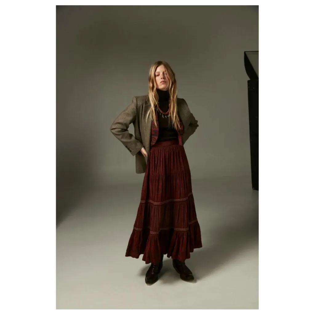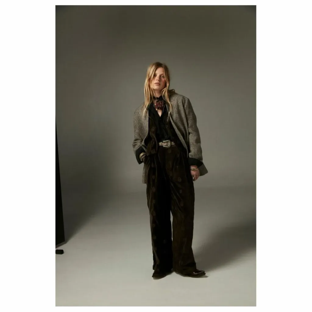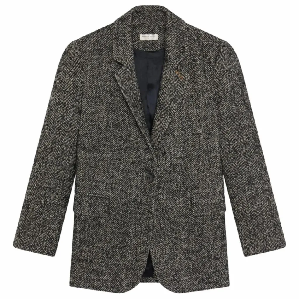 - Blazer en mélange de laine douce, à tissage chevrons anthracite, alliant structure et confort. Sa coupe moderne équilibre le motif classique, tandis que les revers pointus et les poches avant évoquent une allure masculine subtilement adoucie par une ligne décontractée.