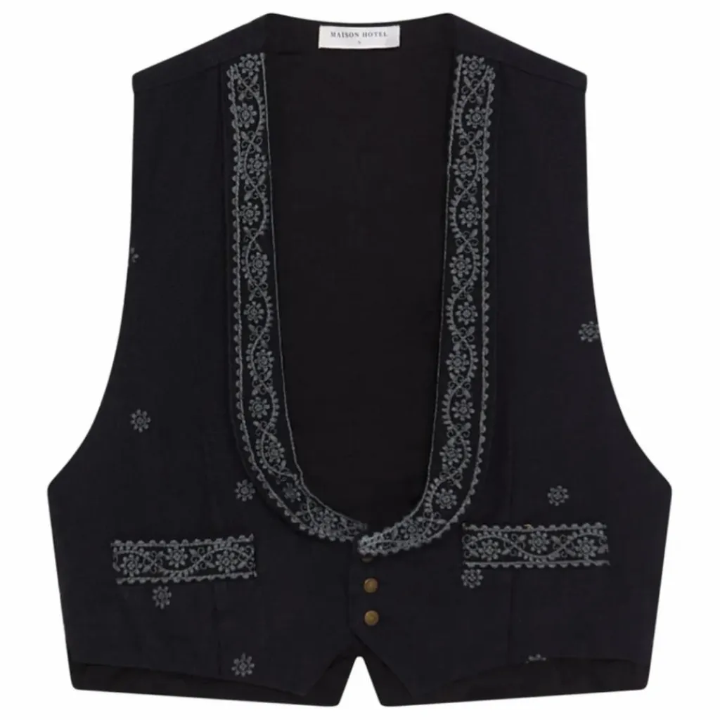 Associé à la chemise Clara Pearl et au pantalon Diego, et complété par la ceinture Bobby Onix, ce look crée un effet de superposition harmonieux. Le gilet se marie également très bien avec une robe noire ajustée, ajoutant de la texture et de la profondeur sans pour autant éclipser la tenue.