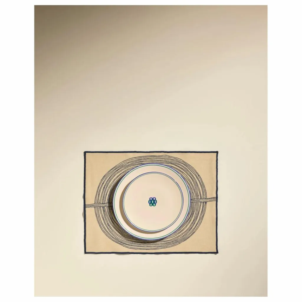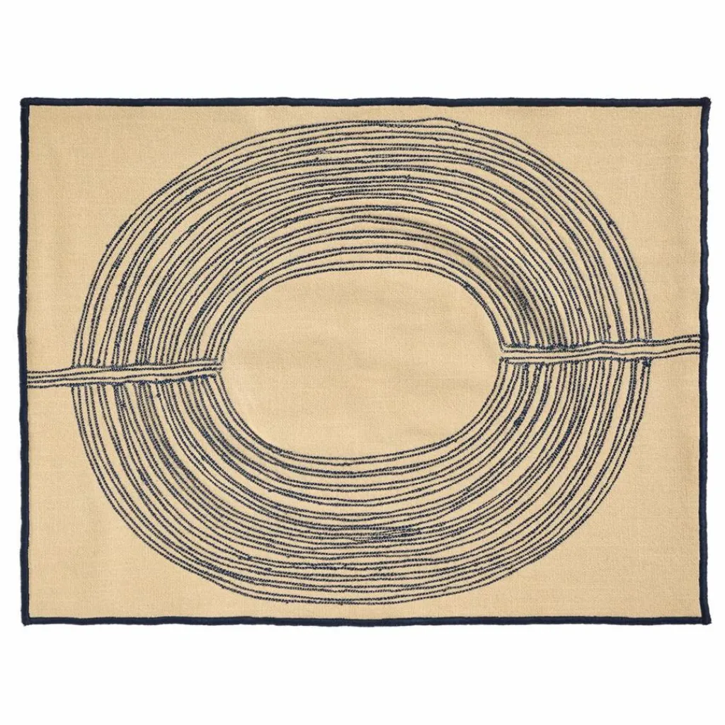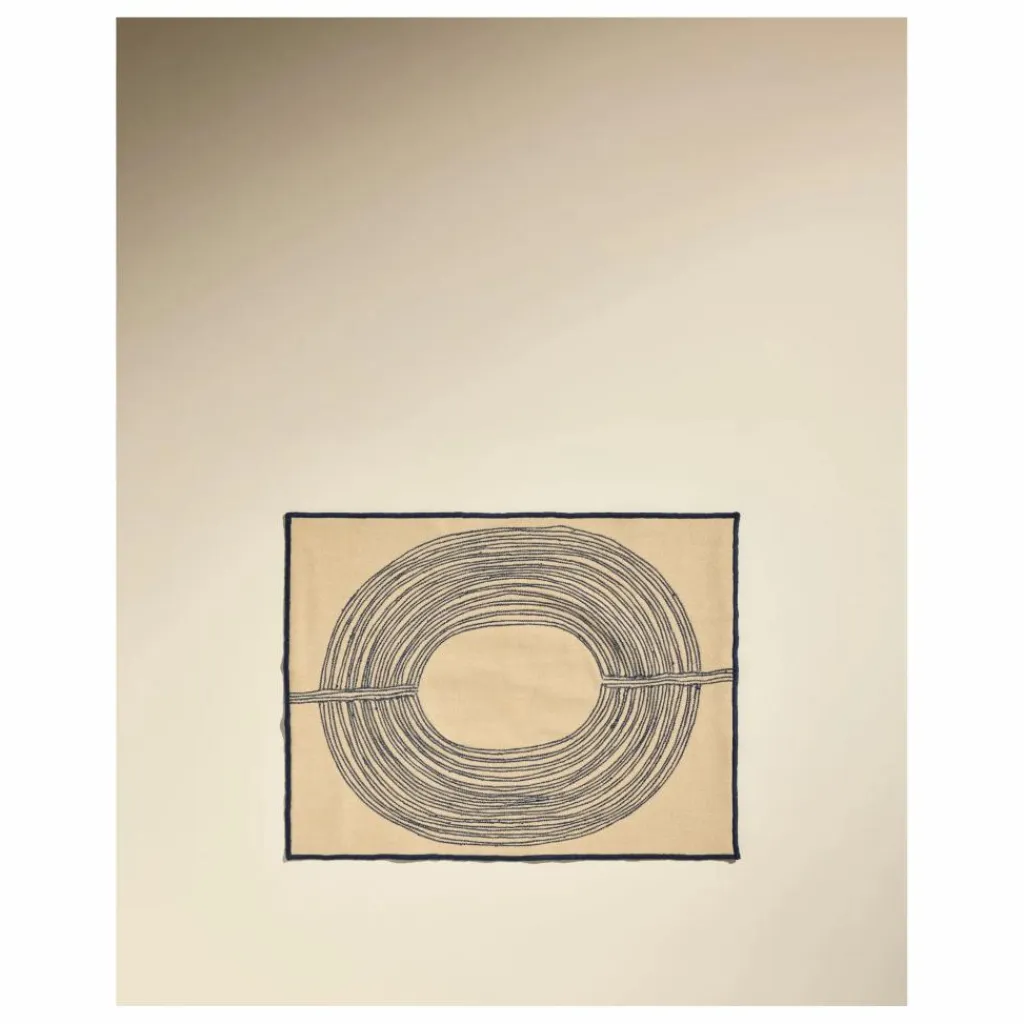 - Broderie couchée, elle consiste à poser un fil épais ou décoratif (dans ce cas, le fil coloré) sur le tissu, sans le faire passer à travers, puis à le fixer à l’aide de petits points de broderie (ici en écru) réalisés avec un autre fil.