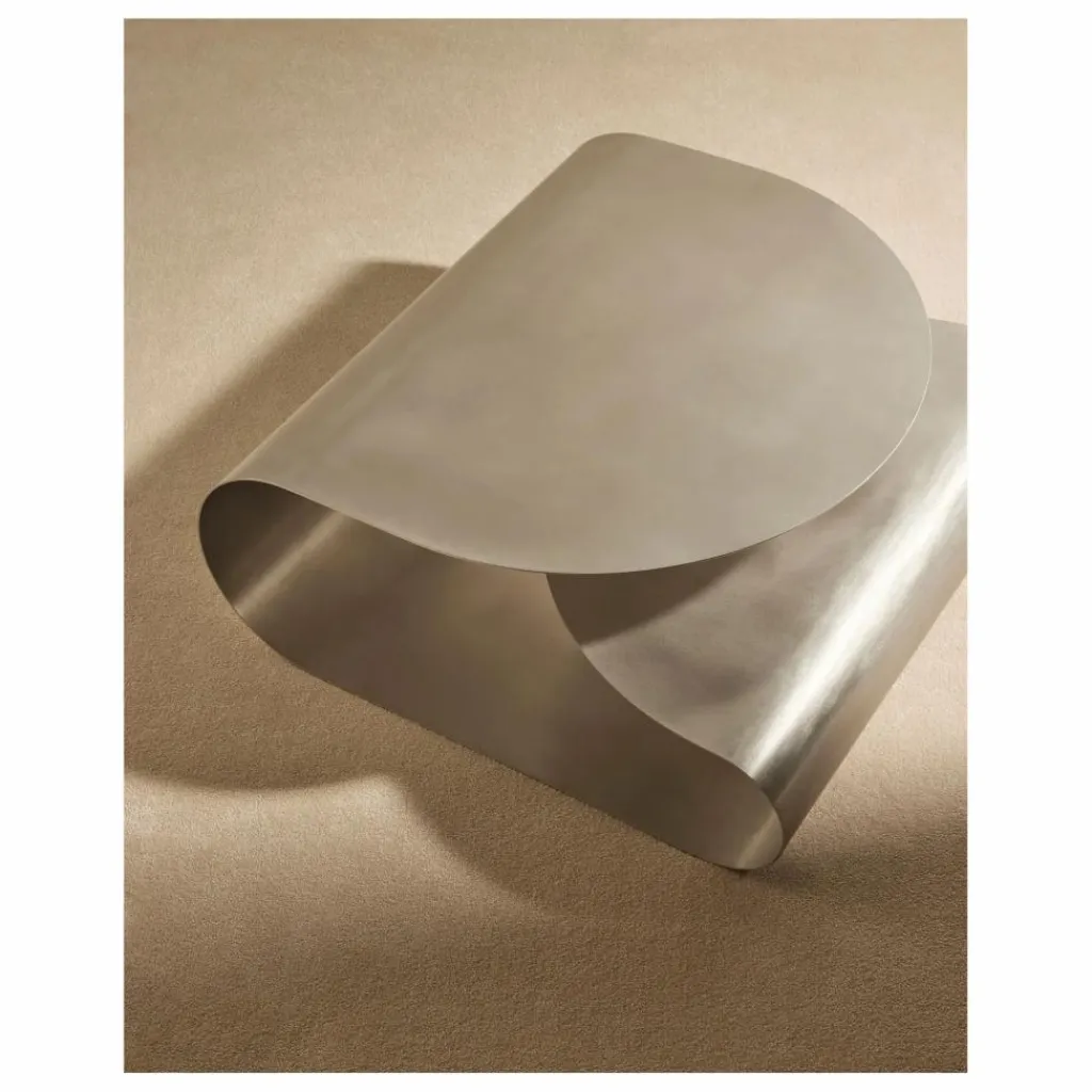 Merveilleusement travaillé, cet élément de mobilier a été imaginé à partir d’une seule feuille d’acier ou d’inox brossé, sans soudure apparente.
