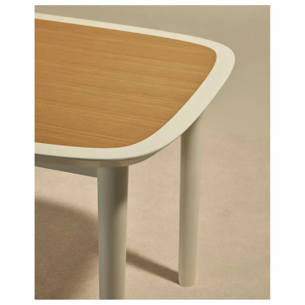 Son piètement laqué haute brillance est en bois de tulipier et ses traverses au même fini laqué sont en sapin.