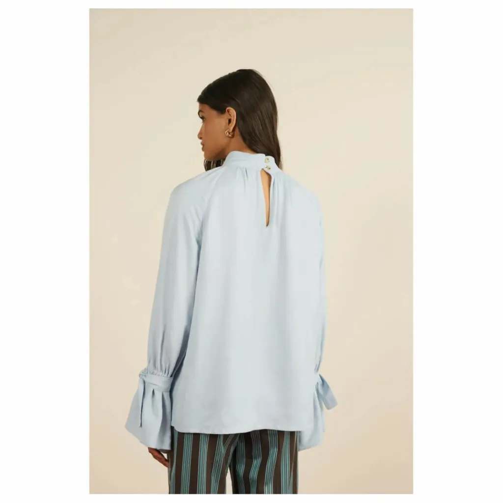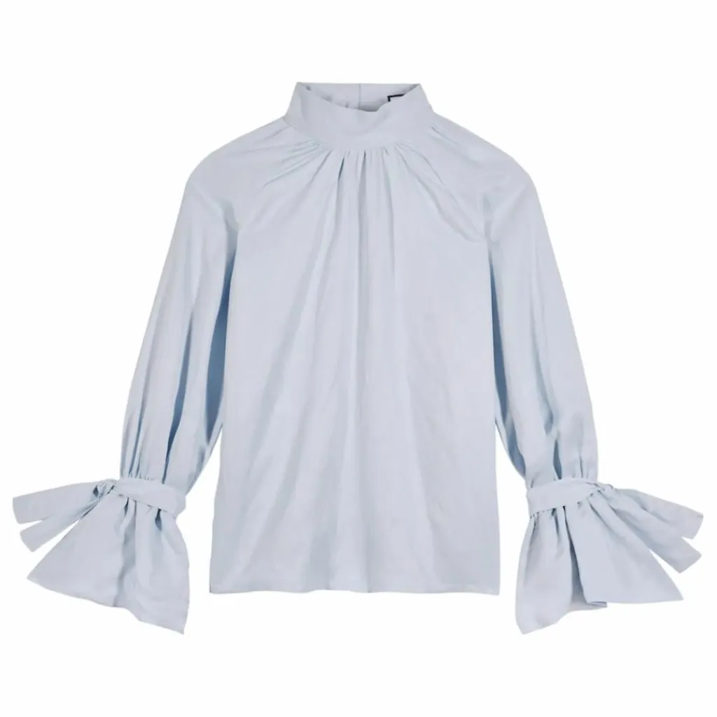 - Haute encolure froncée – Larges poignets volantés ornés de rubans – Coupe décontractée, légèrement en A – Fermeture par boutons à l’arrière de l’encolure – Confectionnée dans un tissu soyeux bleu clair.