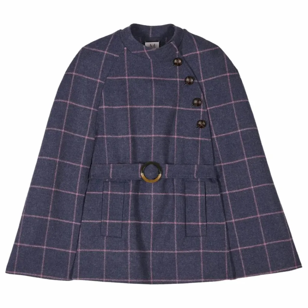 - Cette élégante cape en laine est ornée d’un motif à carreaux bleus, de boutons et d’une taille ceinturée pour une silhouette raffinée et structurée.