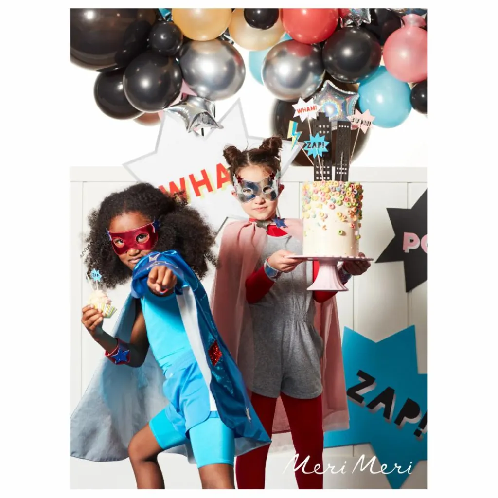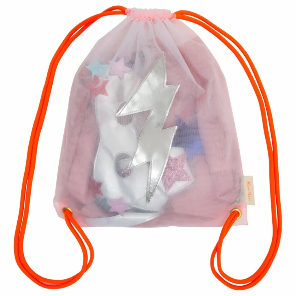 - 1 cape en filet doublée rose, 1 masque, des poignets en similicuir argenté