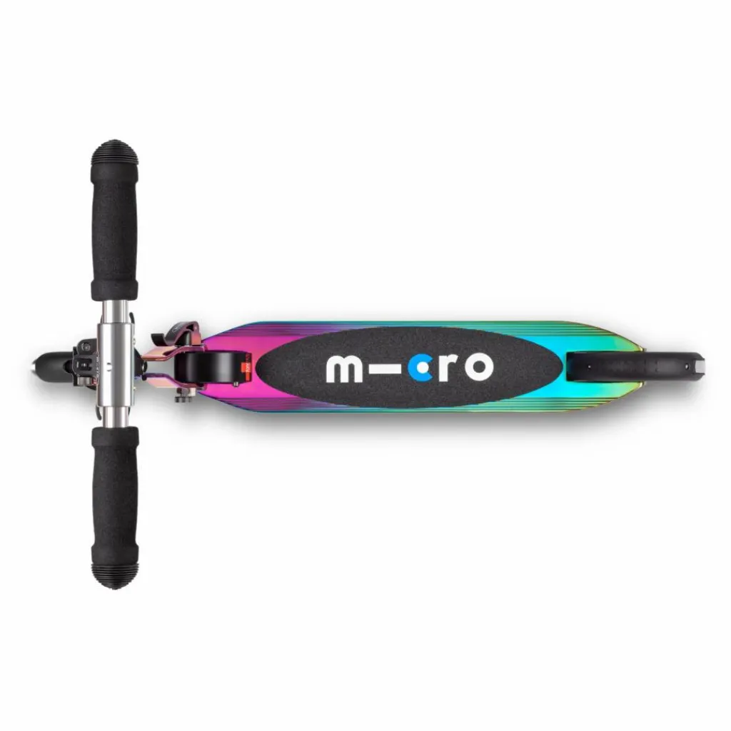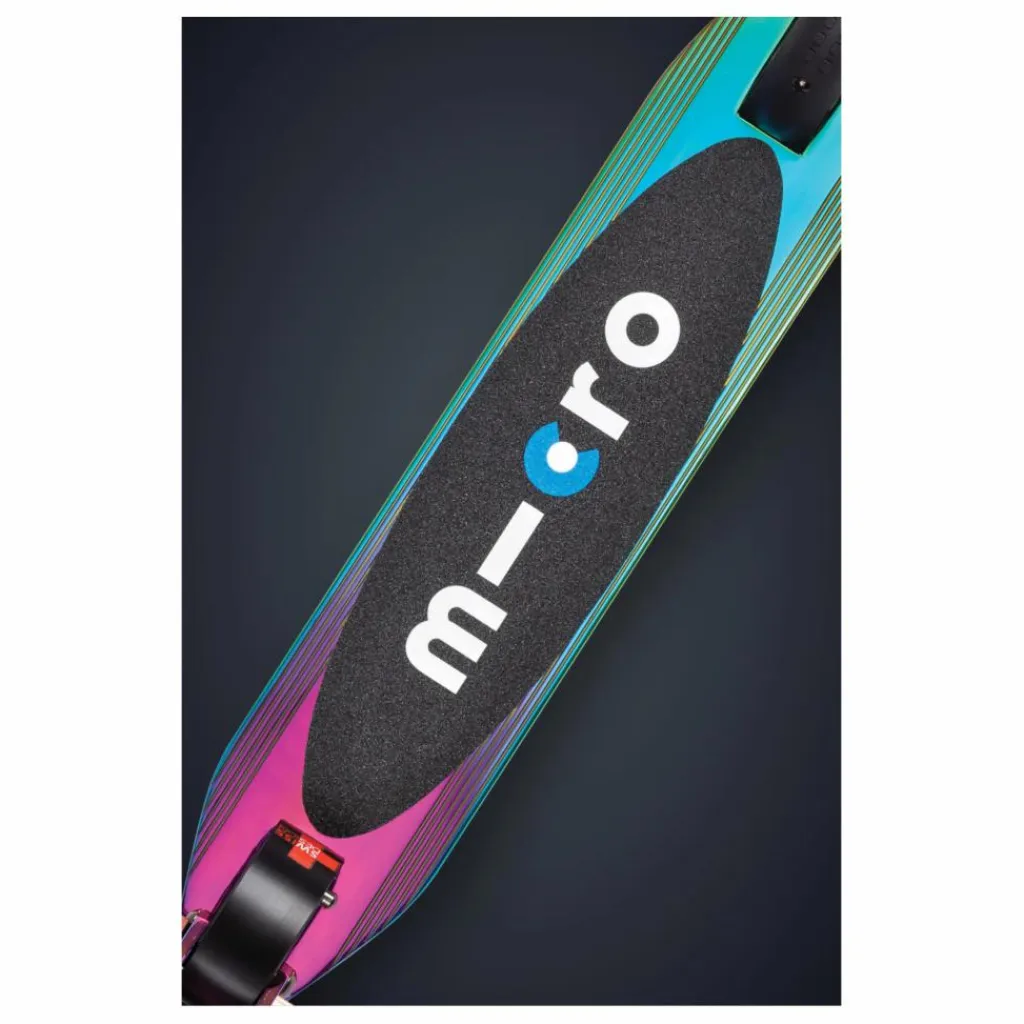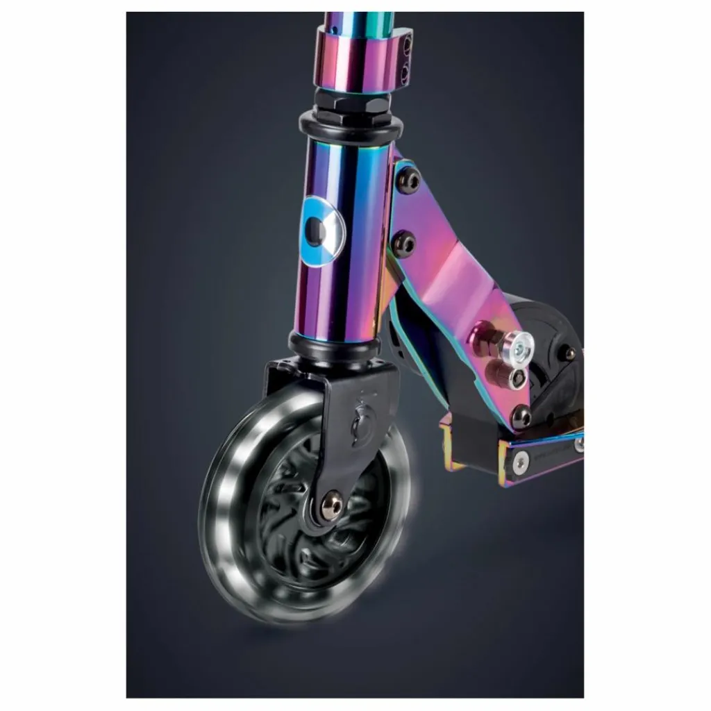 Cette trottinette très maniable et compacte se transporte partout. Les lumières LED intégrées fonctionnent avec l’énergie à induction (sans piles). Lorsque votre enfant avance, les roues s’éclairent. Ce système d’éclairage est une sécurité supplémentaire pour votre enfant lorsqu’il utilise sa trottinette la nuit ou lors de conditions de visibilité difficiles. De plus, cette trottinette se plie facilement et se dirige comme un vélo grâce à son guidon qui tourne à 360°. Redécouvrez la avec sa couleur neochrome, unique à chaque modèle.