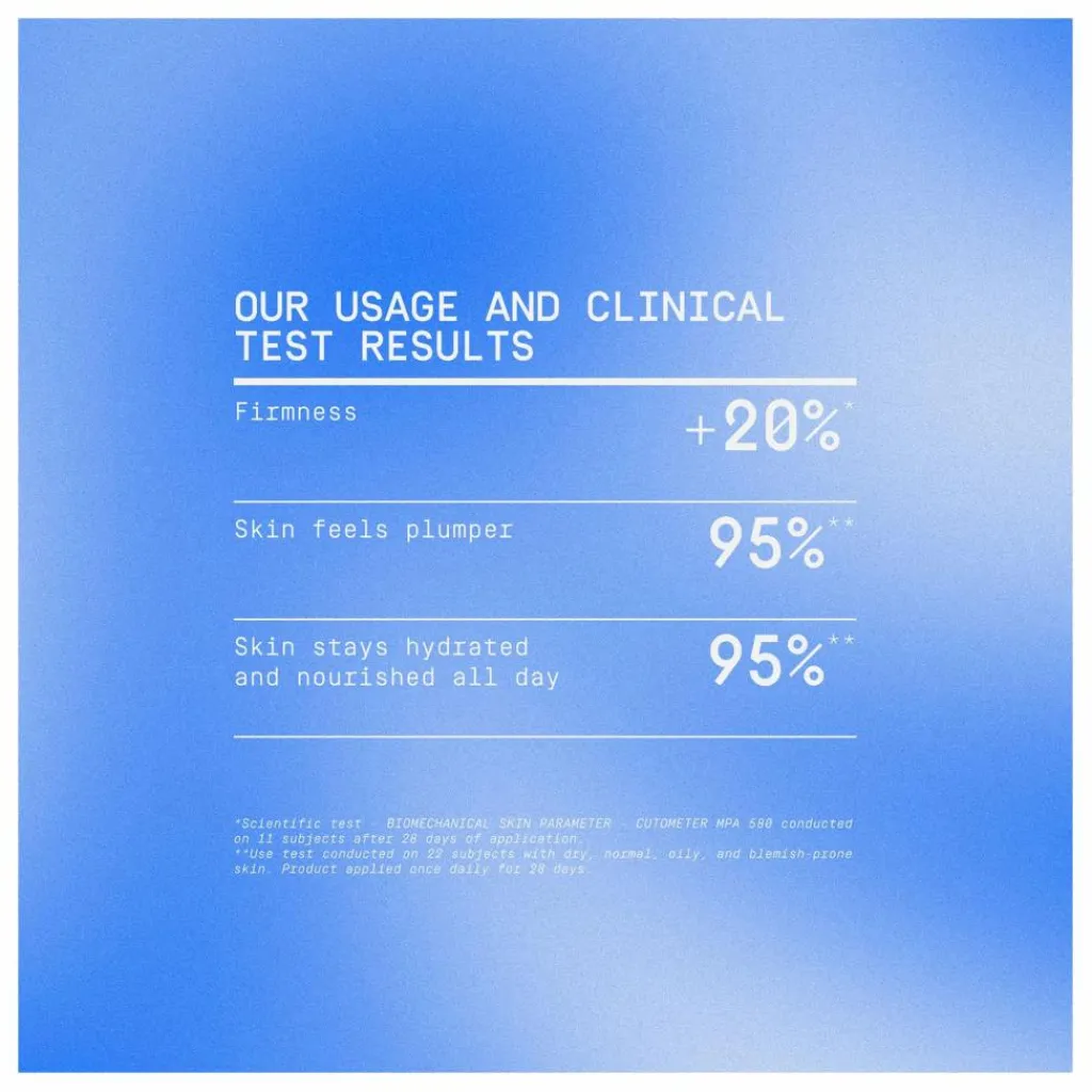 - Repulpe, Raffermie et Hydrate. Plus de 20% de fermeté de la peau en 28 jours.