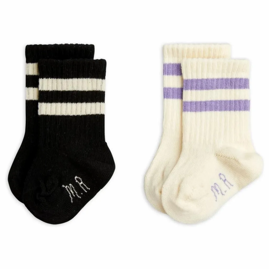 - Deux paquets de chaussettes pour bébé décorées de rayures, fabriquées à partir d’un mélange de coton biologique certifié GOTS et de polyamide extensible. Les chaussettes sont douces au toucher et ont des embouts et des talons renforcés. M.R est imprimé sous chaque pied.