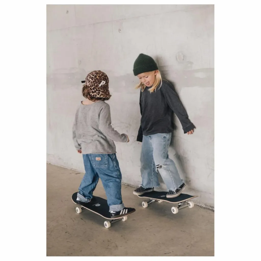 - La board Sunny, c’est une planche de skate « comme les grands » mais adaptée aux enfants : plus courte tout en restant assez large, elle permet de rouler de façon stable et de commencer à apprendre des tricks. Petite planche, grandes aventures !