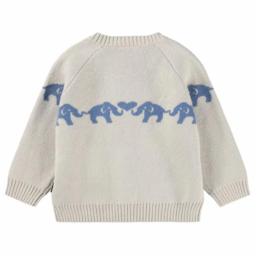 - Ce cardigan en tricot blanc cassé de Molo est réalisé dans un doux mélange de coton et de laine avec une bordure d’éléphants bleus. Le cardigan présente une encolure ronde avec des côtes, des côtes à la taille et aux manches, et une fermeture boutonnée sur le devant.