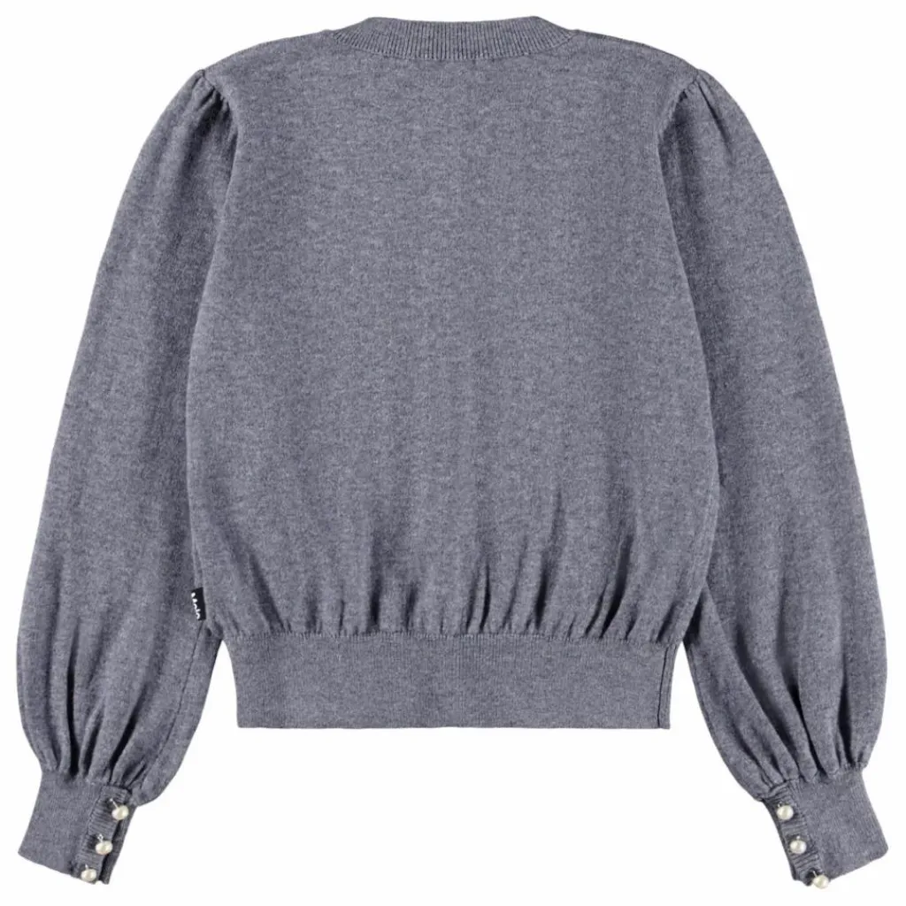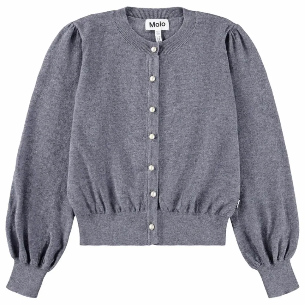 - Ce joli cardigan gris de Molo est fait d’un mélange de laine et de coton. Le cardigan a de larges manches ballon et des boutons en perle sur les manches et tout le long du devant. De larges côtes sur les manches et à la taille, ainsi qu’un bord côte autour du cou, donnent une belle finition.