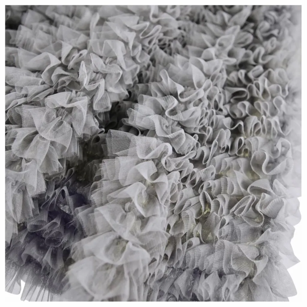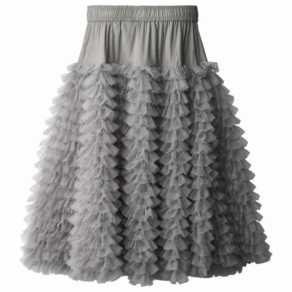 - Cette jupe en tulle gris de Molo a une coupe volumineuse avec de nombreuses couches de tulle qui ressemblent à des volants. L’élastique à la taille assure un ajustement confortable, et la jupe descend jusqu’au milieu du tibia.