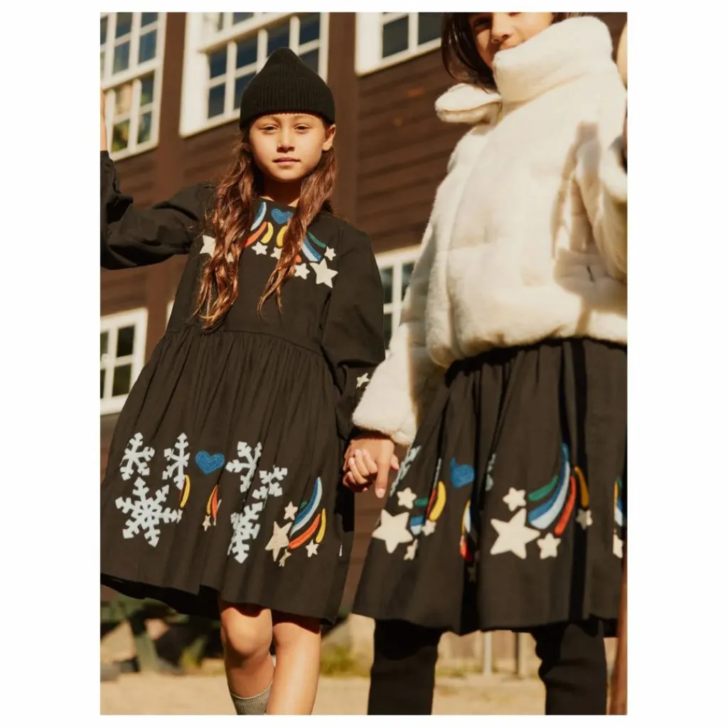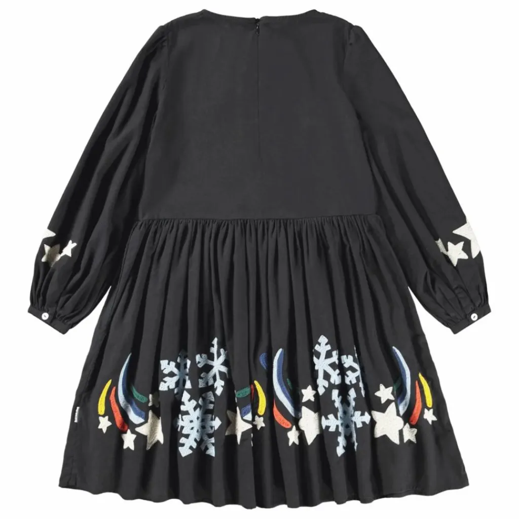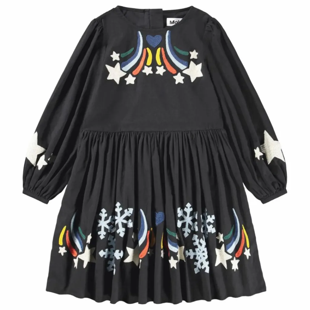 - Cette robe noire de Molo, qui descend jusqu’aux genoux, est en coton et comporte une fermeture éclair invisible dans le dos pour faciliter l’habillage. Elle présente une jupe volumineuse, une encolure ronde et des manches longues boutonnées et bordées de ruban. Elle est coupée à la taille et décorée de cristaux de glace et d’étoiles filantes brodés.