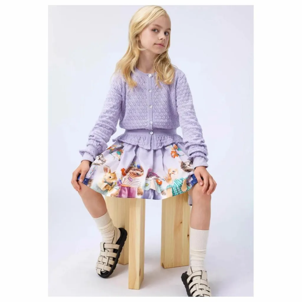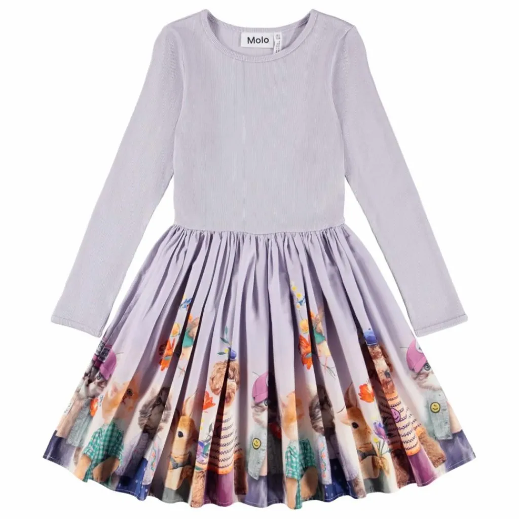 - Cette robe violette à manches longues en coton biologique est composée d’un haut ajusté en jersey côtelé et d’une jupe en popeline. La robe a une coupe régulière avec un imprimé d’animaux habillés sur la jupe.