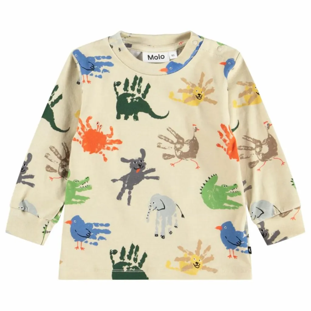 - Ce haut beige de Molo est fabriqué en jersey de coton biologique et présente une empreinte de main colorée représentant divers animaux. Il a des manches longues, des poignets côtelés et deux boutons pression sur l’épaule gauche.