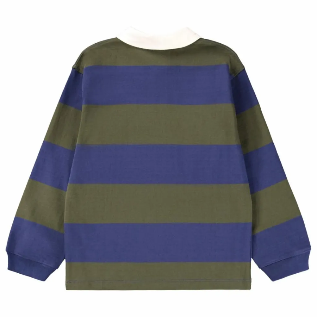 - Cette chemise de rugby à larges rayures de Molo est fabriquée en coton biologique doux dans des tons bleus et verts foncés. Elle présente une coupe régulière, des manches longues avec poignets côtelés, un col chemise blanc et une patte de boutonnage avec trois boutons cachés.
