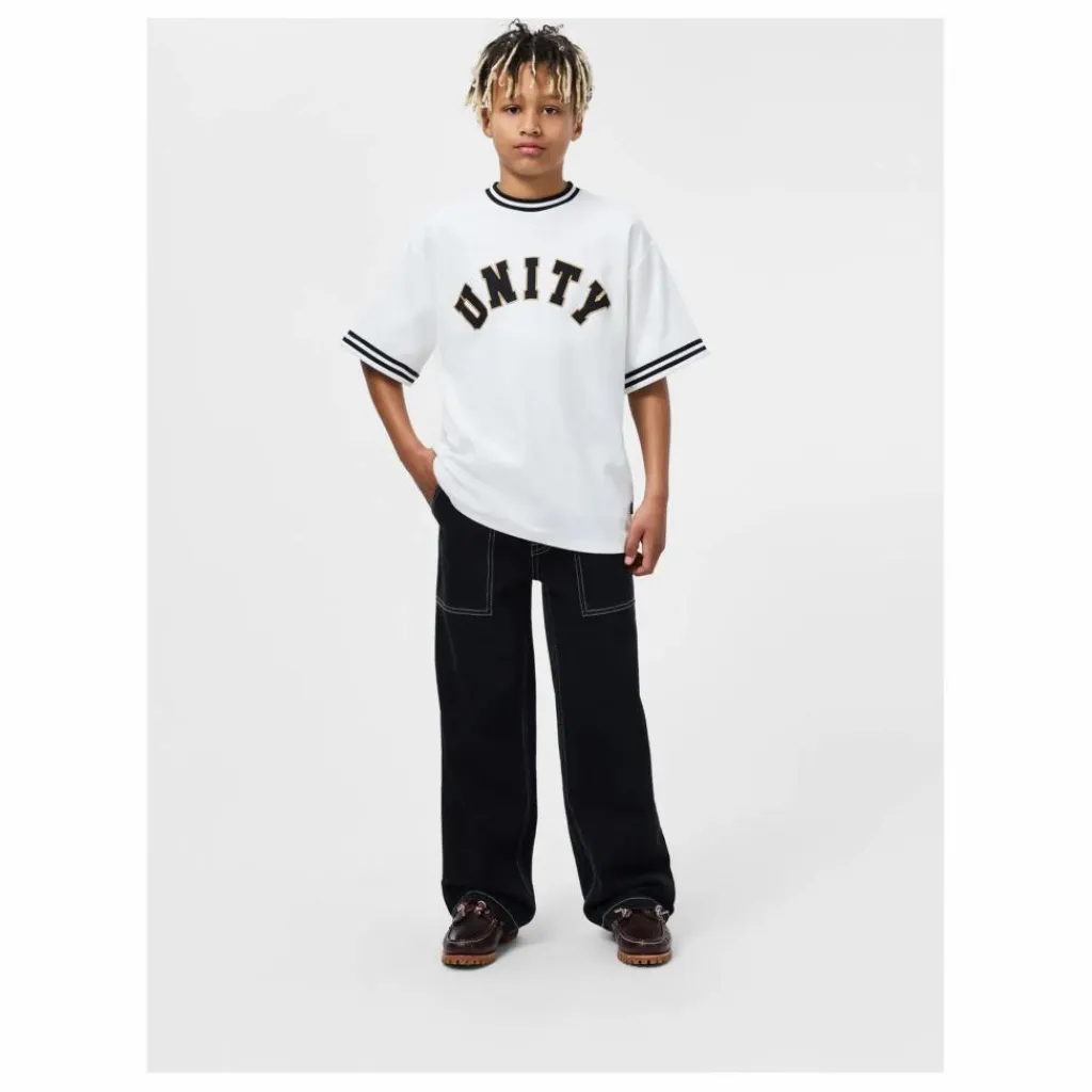 - Ce t-shirt à la coupe décontractée présente une encolure ronde classique et des bordures rayées au niveau du col et des manches. Le design sportif est complété par l’impression audacieuse « Unity » sur le devant, ce qui en fait un choix parfait pour les journées actives. Conçue pour le confort et le style, cette pièce polyvalente est idéale pour être superposée ou portée seule, pour que les petits aient l’air bien pendant qu’ils jouent.