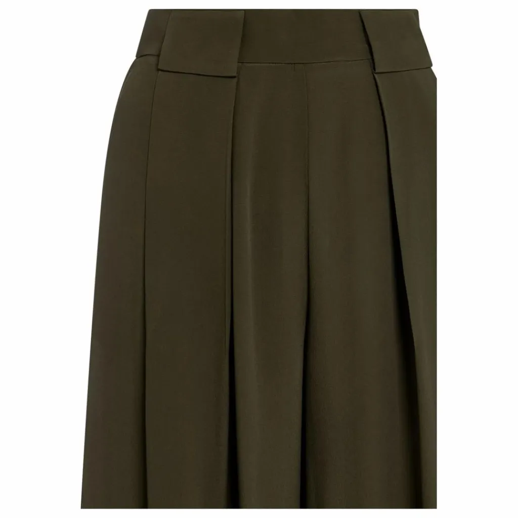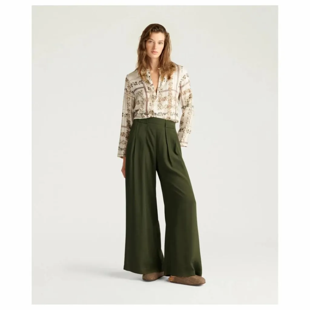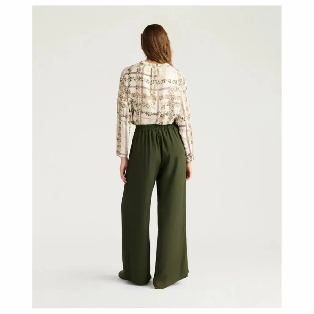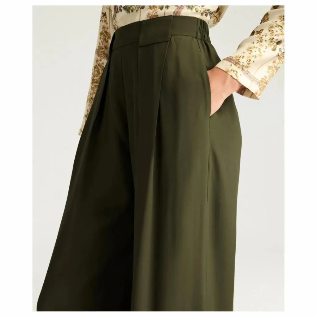 - Pantalon en crêpe doux mélangé de soie carry-over, au palais, à la ligne large et aérée. Plis frontaux bloqués par maxi passants, poches insérées dans le côté et ceinture élastique à l’arrière.