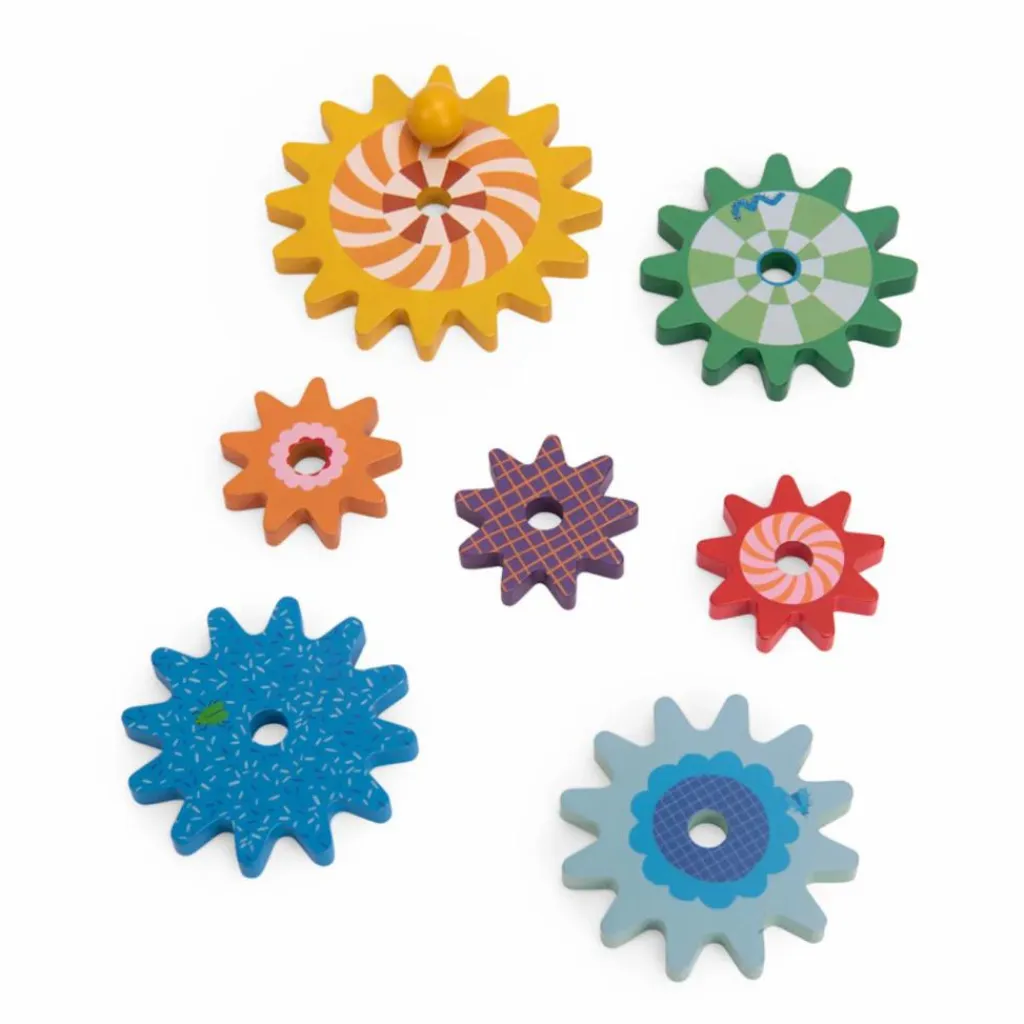 Ce jeu en bois permet de découvrir les mécanismes à engrenages. 7 roues crantées multicolores à positionner au bon endroit sur les piliers en bois. En actionnant la roue jaune avec la poignée, l’ensemble se met à tourner dans tous les sens !