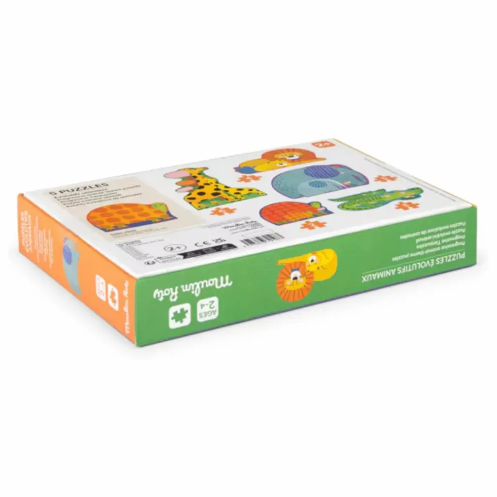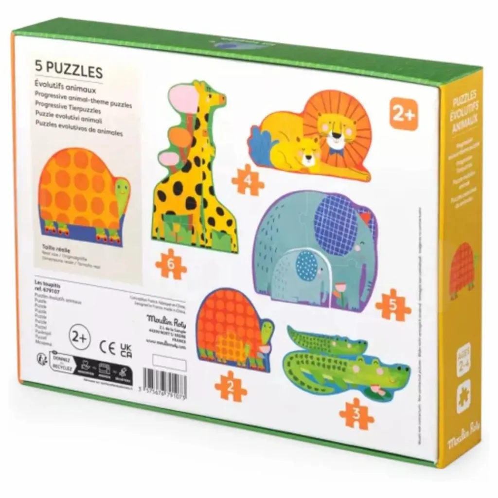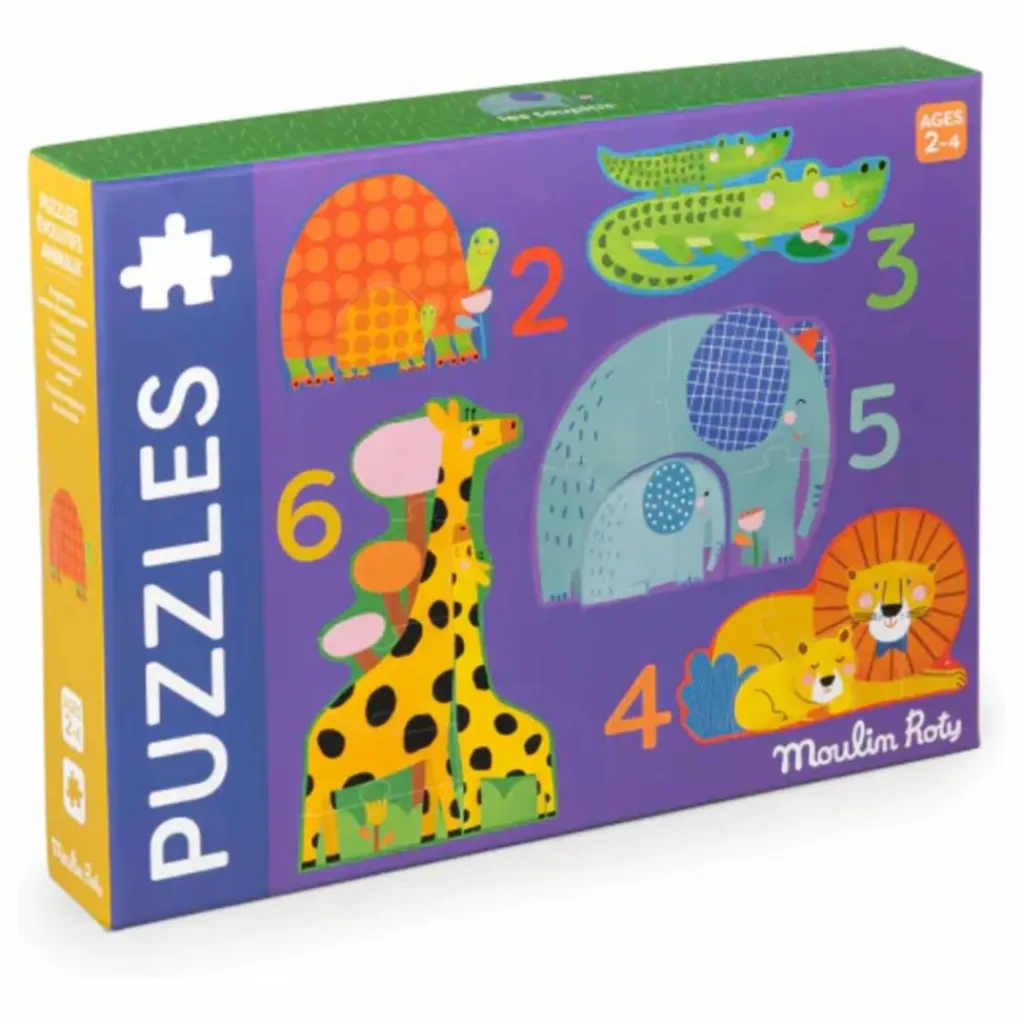 - 5 puzzles de 2 à 6 pièces, faciles à réaliser et parfaits pour apprendre à compter. Evolutif à partir de 2 ans et jusqu’à 4 ans.