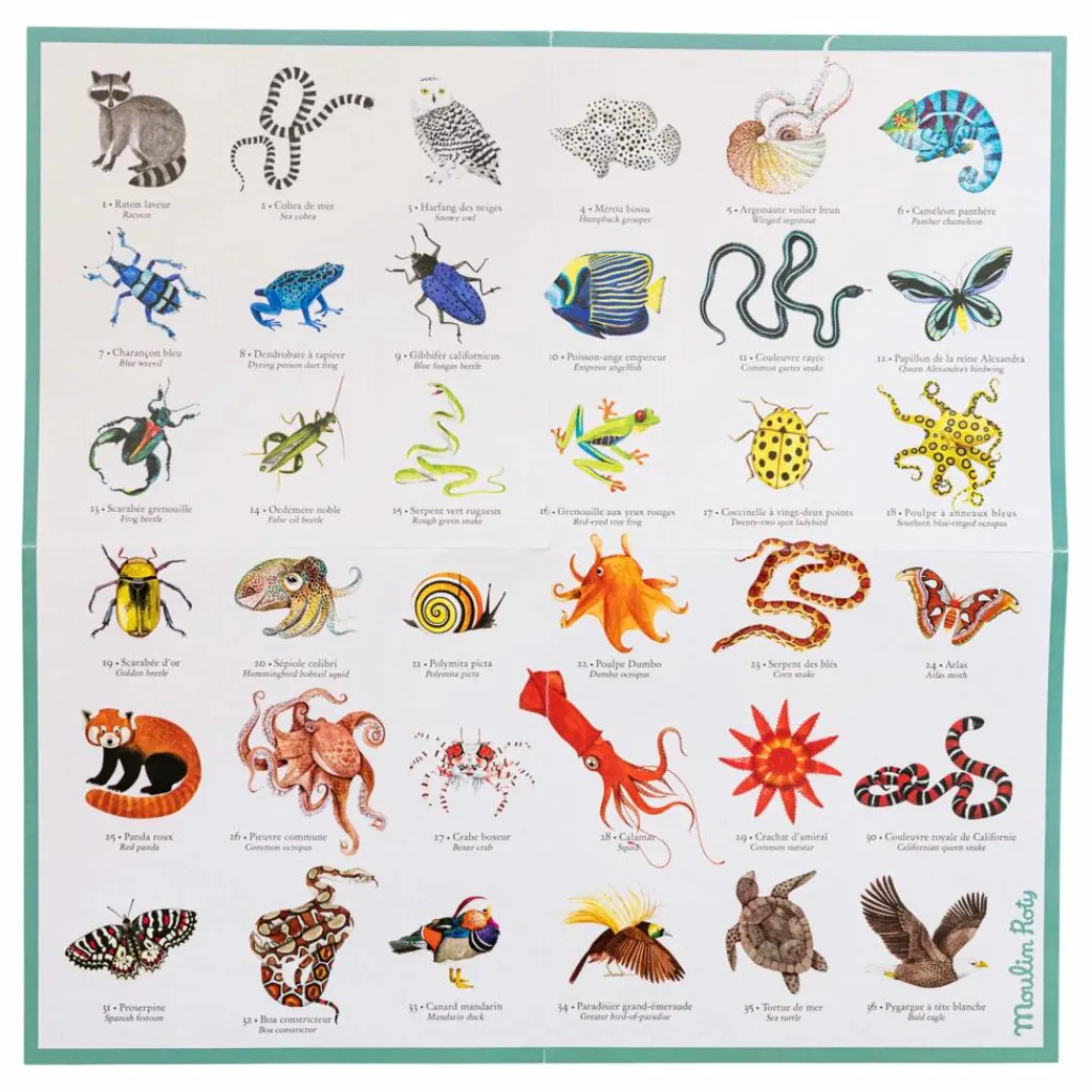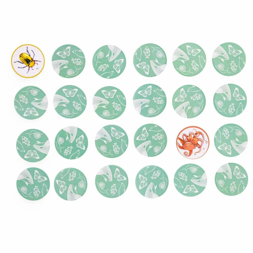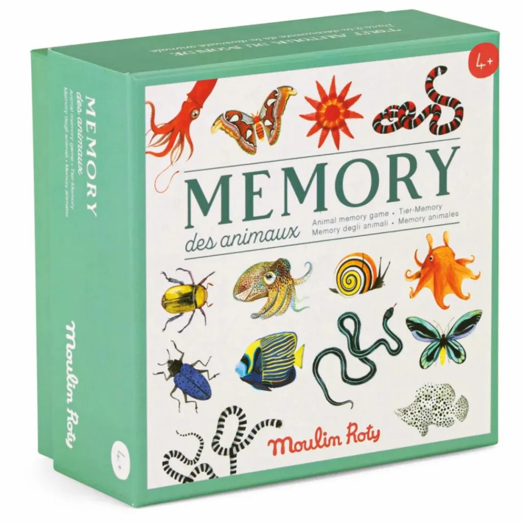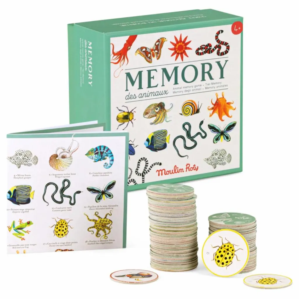Ce jeu d’observation et de mémoire aborde le thème des animaux. Toutes les cartes sont faces cachées sur la table, celui qui collecte le plus de paires d’animaux est le gagnant.