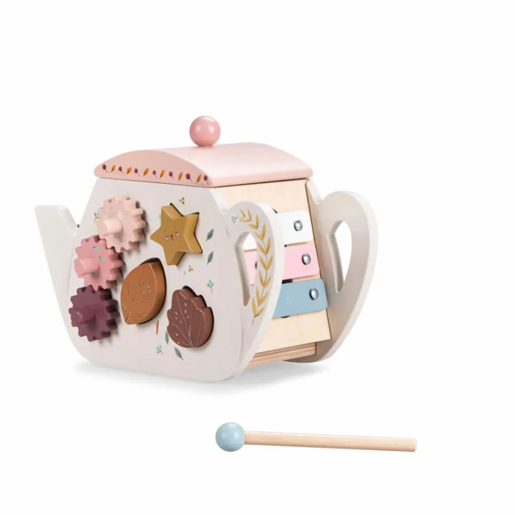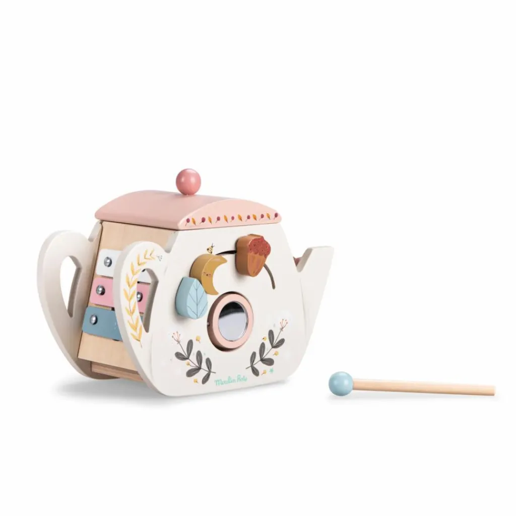 Cette théière propose plusieurs activités à votre enfant. Chacune des 4 faces promet de jolies découvertes de jeux et d’apprentissages : boulier, formes à encaster, roues dentées à faire tourner, xylophone… Il y a même un petit miroir dissimulé !