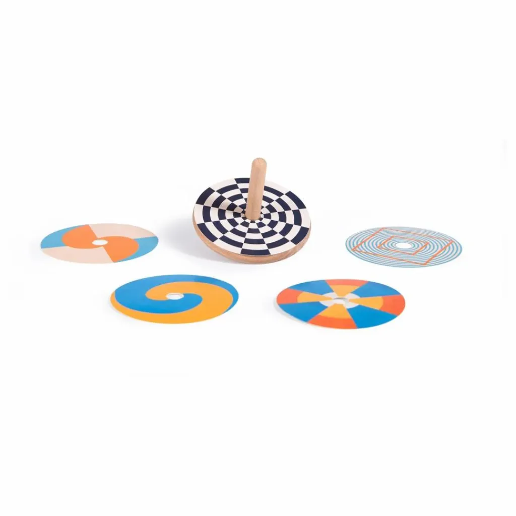 Choisissez une des cartes selon l’effet souhaité, positionnez-la sur le socle de la toupie et faites-la tourner !