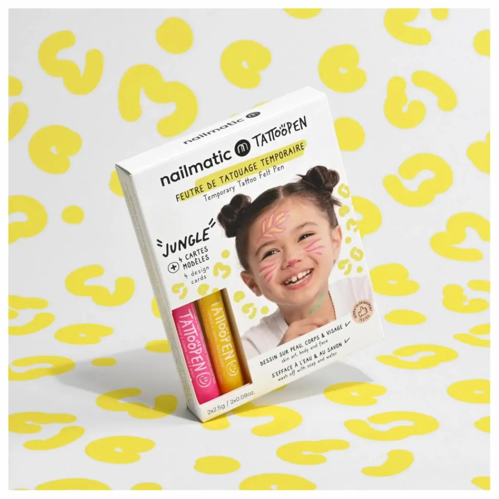 - Contient un feutre de tatouage rose, un feutre de tatouage jaune, 4 cartes recto/verso avec des modèles à tester et une carte mode d’emploi recto/verso.