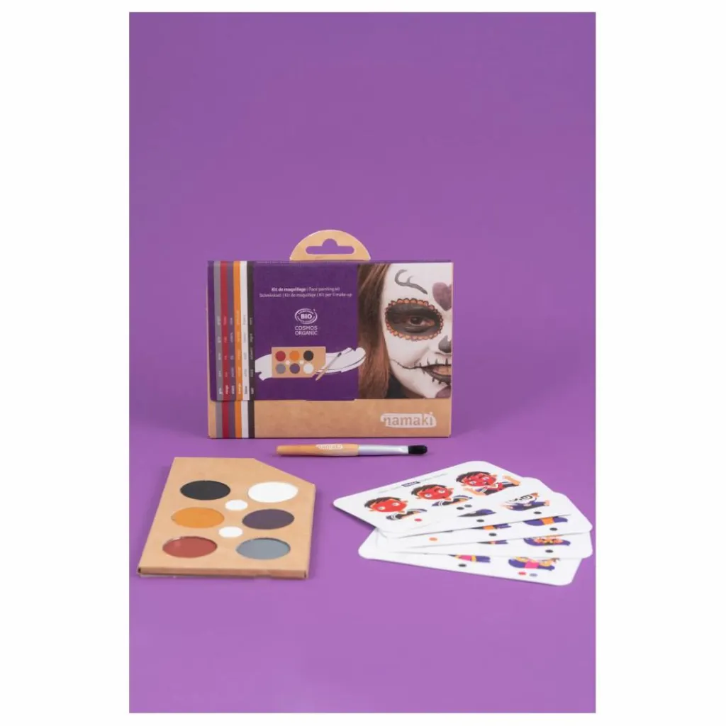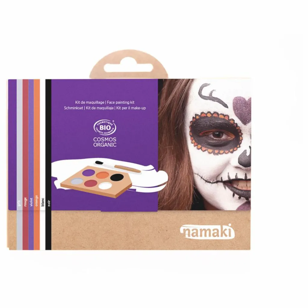 - 1 palette carton décorée, 1 pinceau cosmétique, 5 cartes tutos de modèles de maquillage , 6 fards (6 x 2.5 g) : Blanc, Gris, Noir, Orange, Rouge, Violet