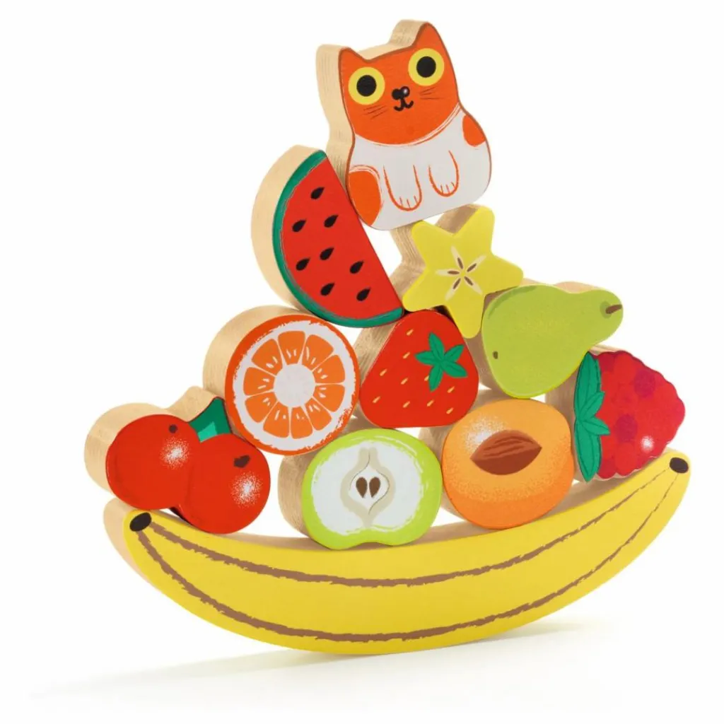 Puzz & Boom est un puzzle en bois facile à assembler et un jeu d’équilibre. Les fruits et le chat en relief tiennent debout et peuvent se poser en équilibre les uns sur les autres pour former une pyramide sur le socle « banane ».